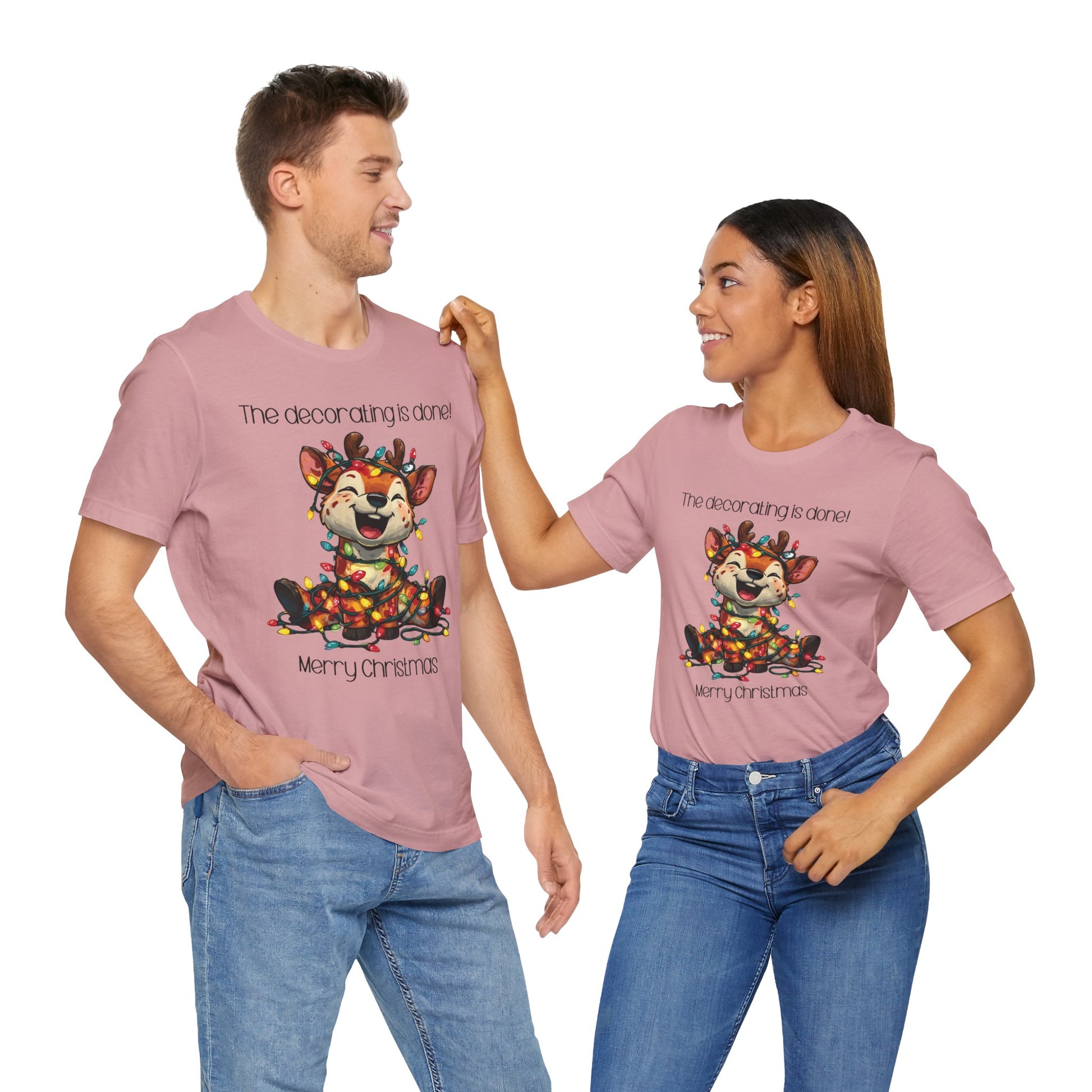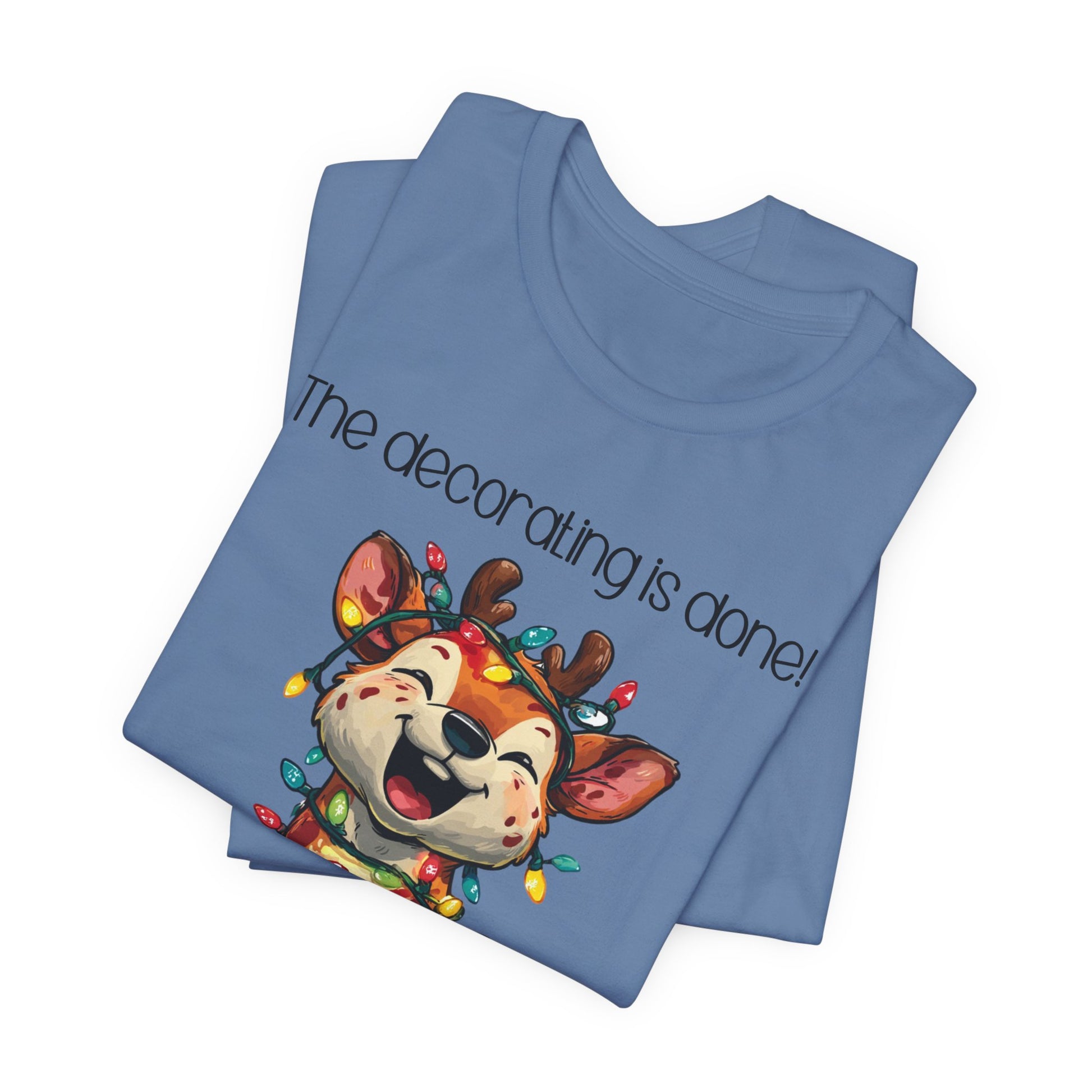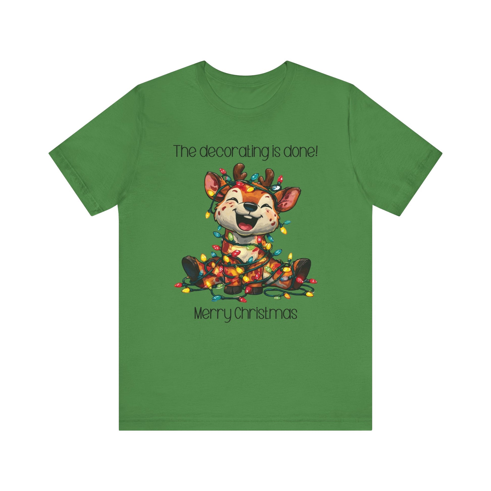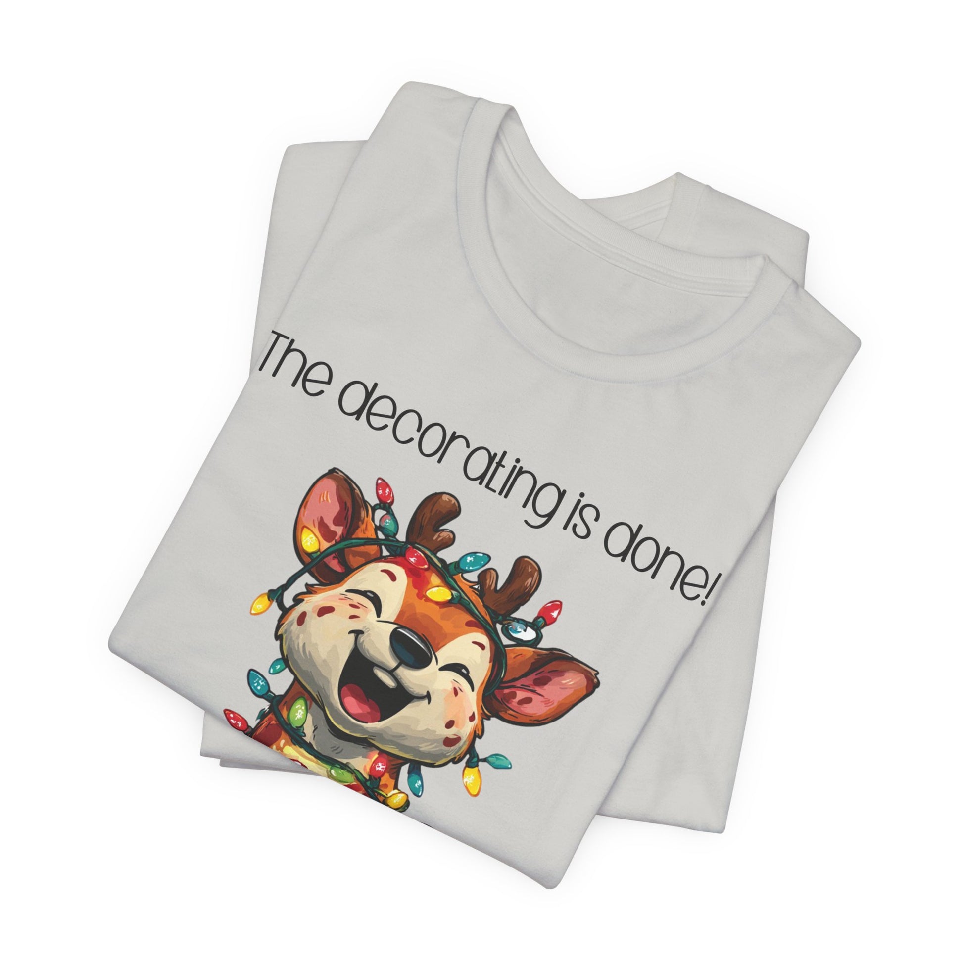 This funny tee shirt for Christmas states 'The decorating is done! Merry Christmas'. There is a laughing reindeer wrapped in Christmas lights. It is just a cute tee shirt that shows the decorating is completed by the reindeer being decorated. A fun Christmas shirt for all.