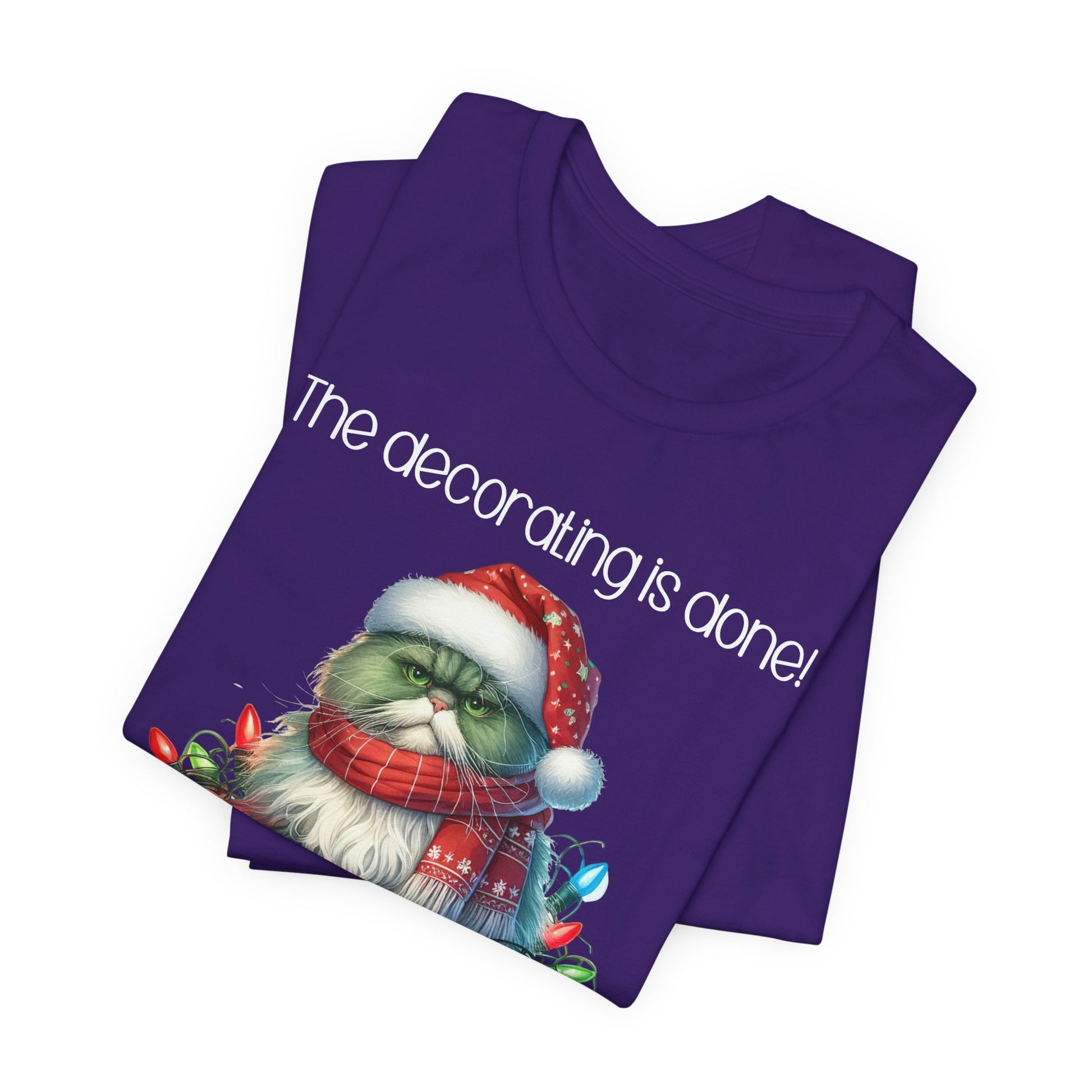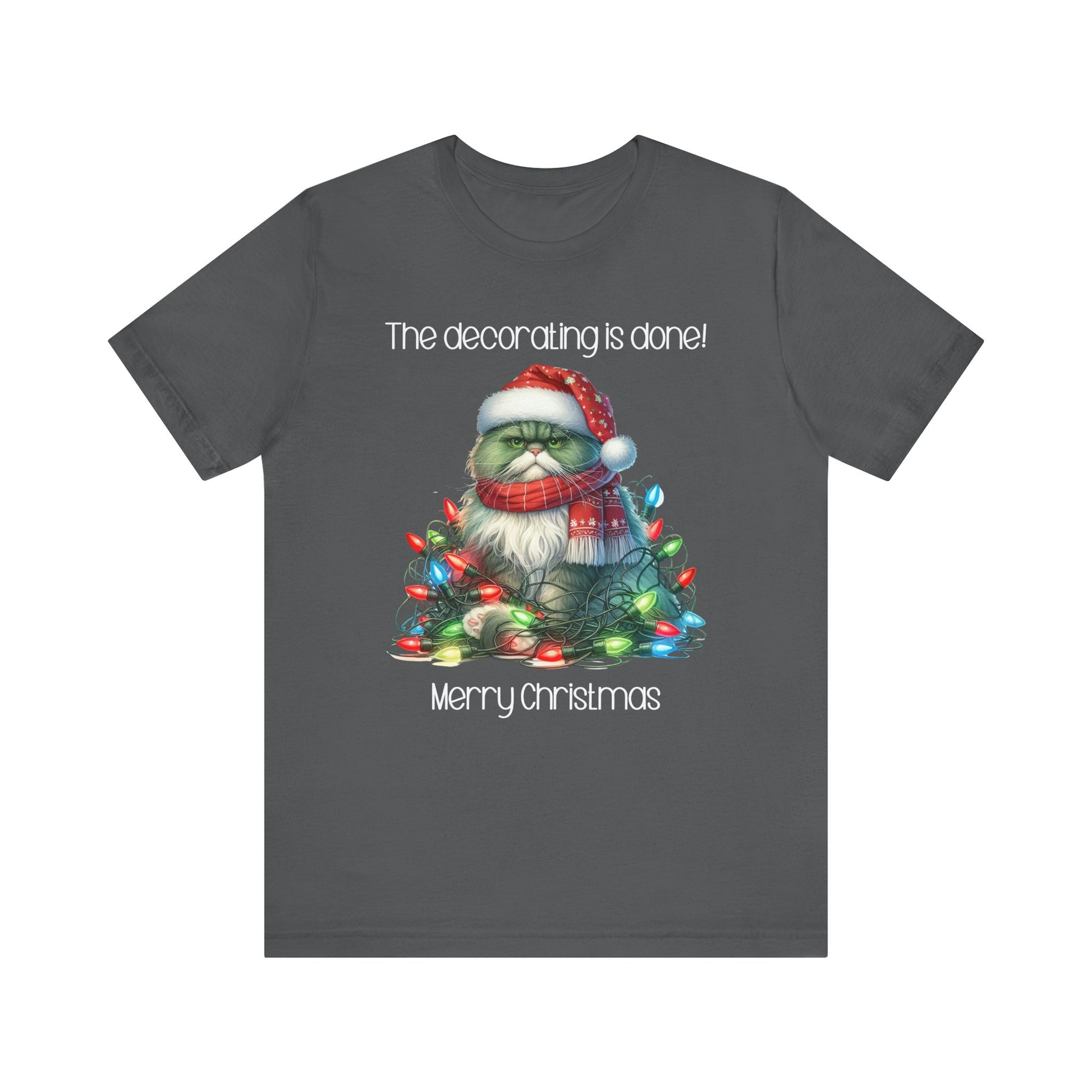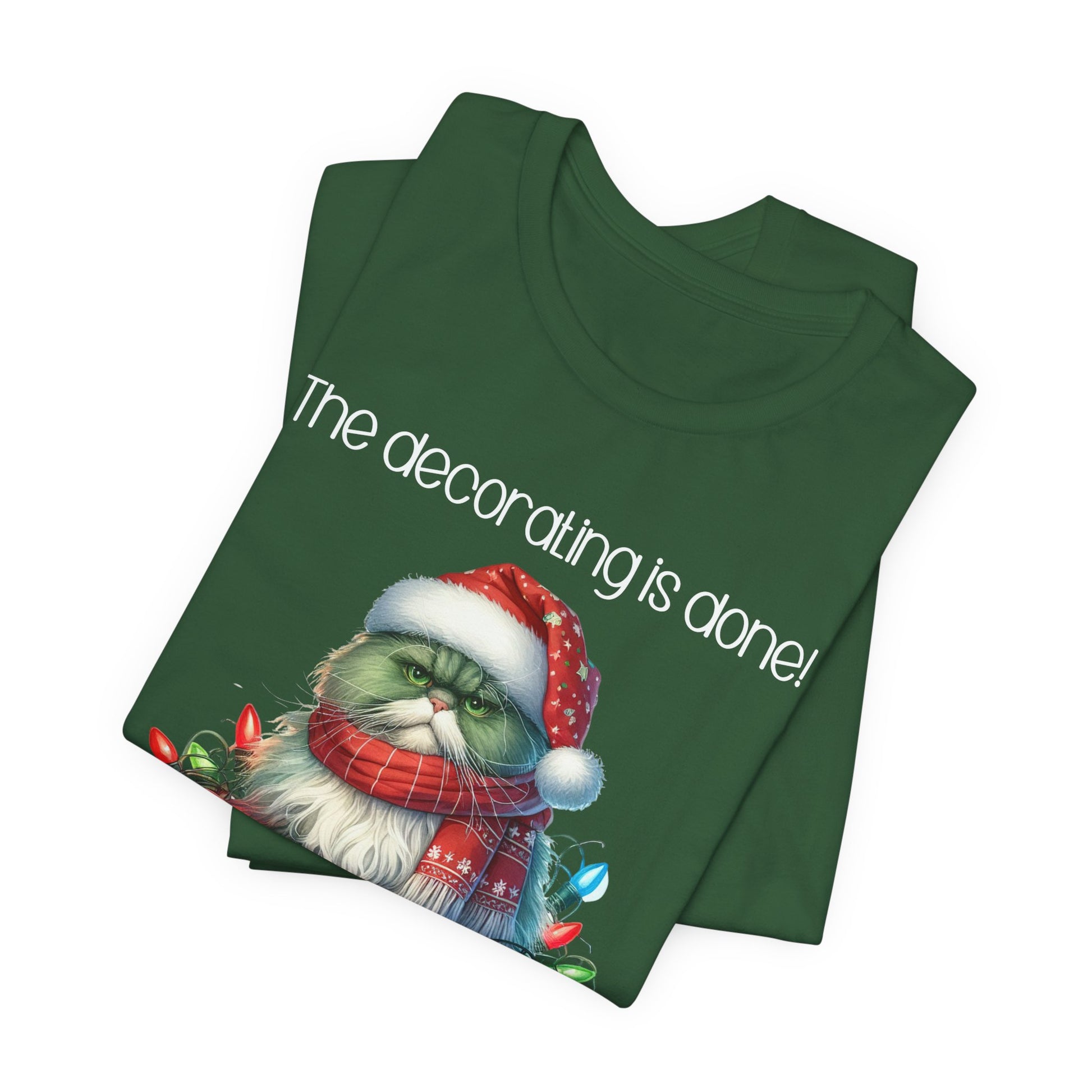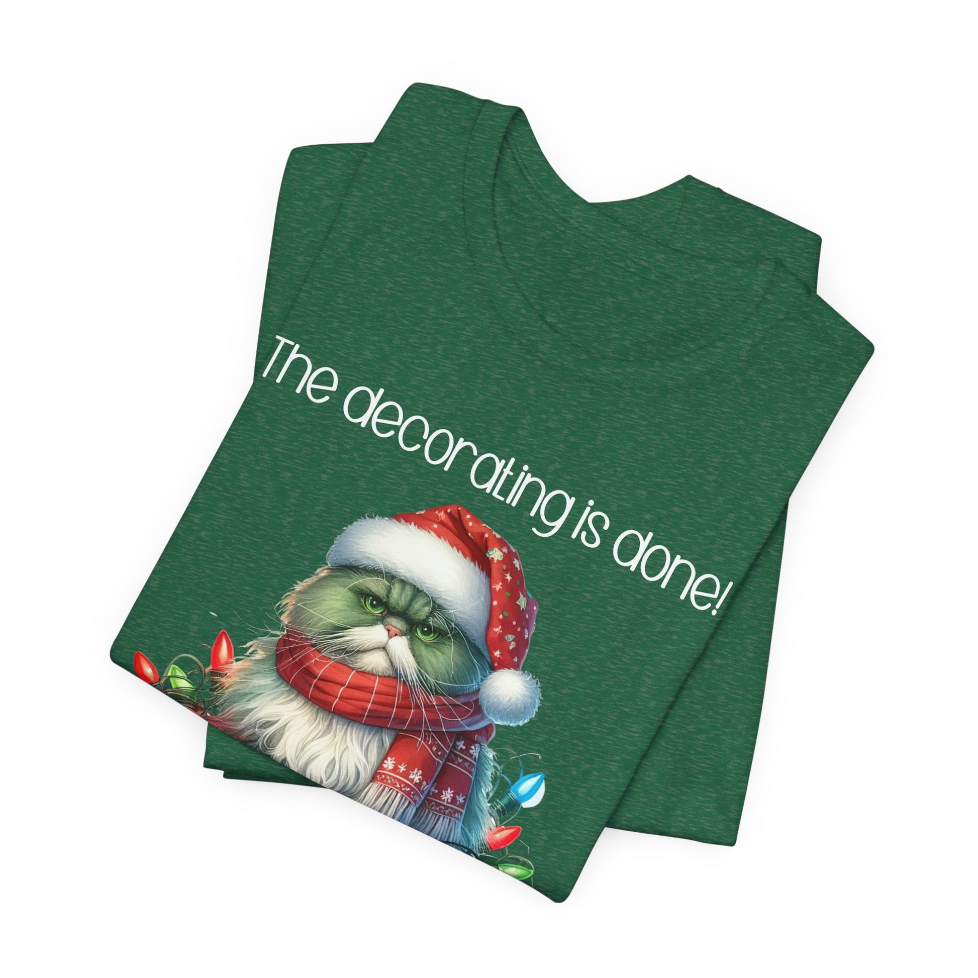This funny tee shirt for Christmas states 'The decorating is done! Merry Christmas'. There is a green cat wrapped in Christmas lights. It is just a cute tee shirt that shows the decorating is completed by the cat being decorated. A fun Christmas shirt for all.