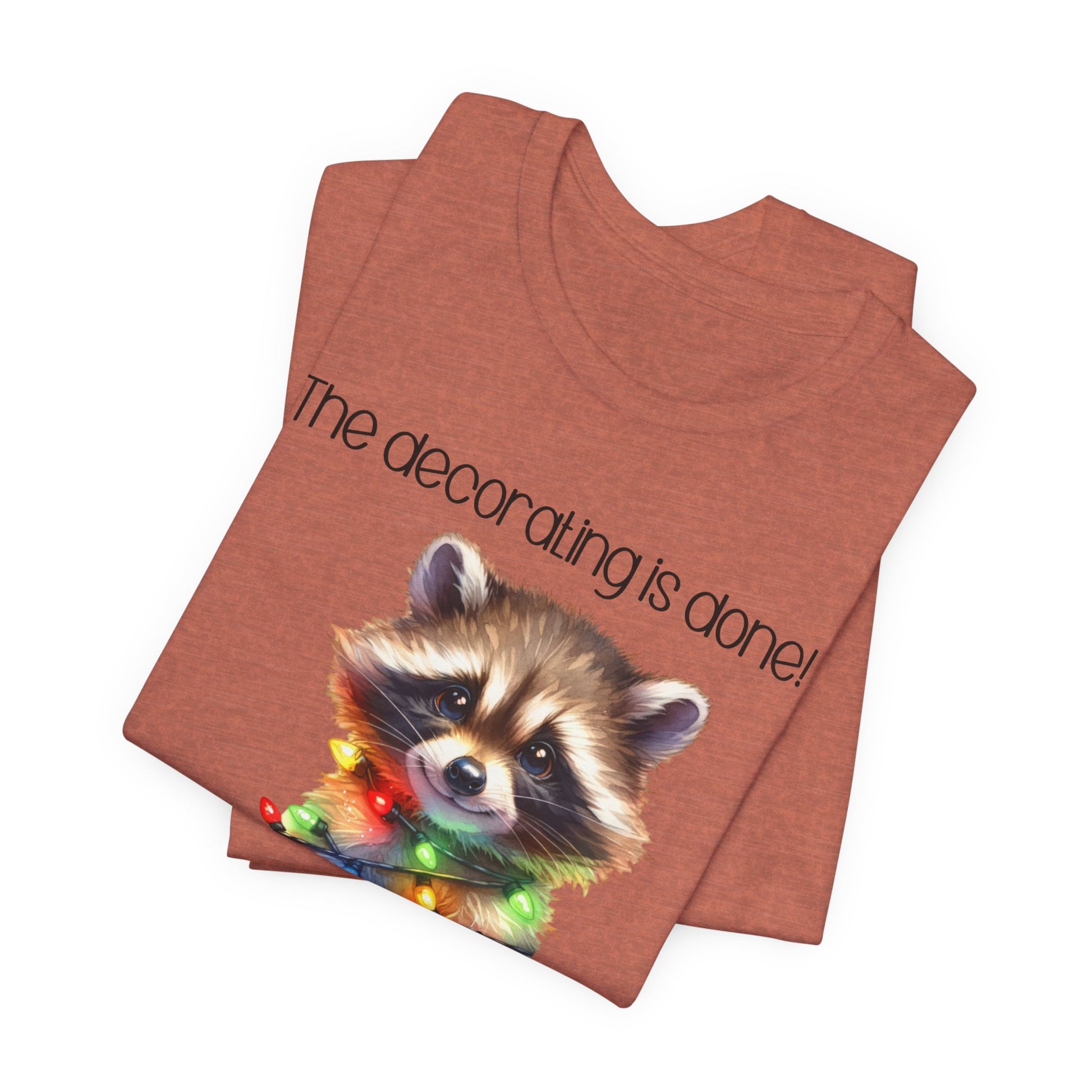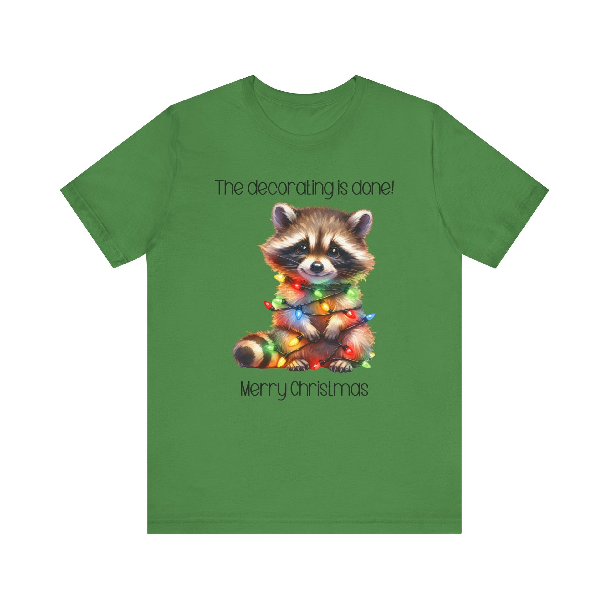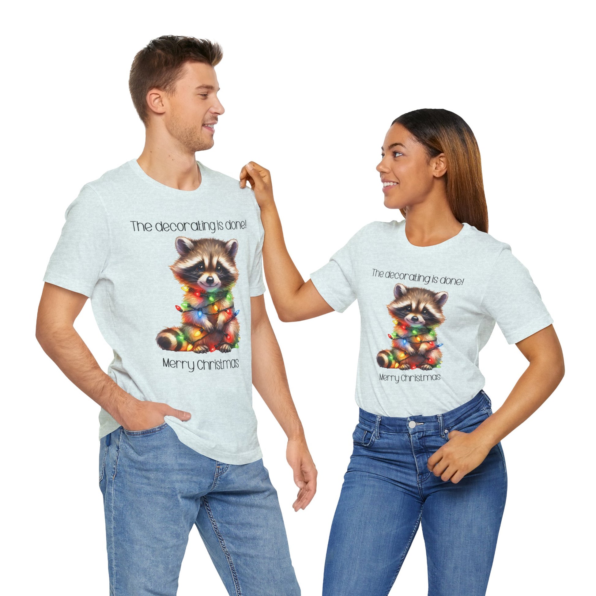 This funny tee shirt for Christmas states 'The decorating is done! Merry Christmas'. There is a raccoon wrapped in Christmas lights. It is just a cute tee shirt that shows the decorating is completed by the raccoon being decorated. A fun Christmas shirt for all.