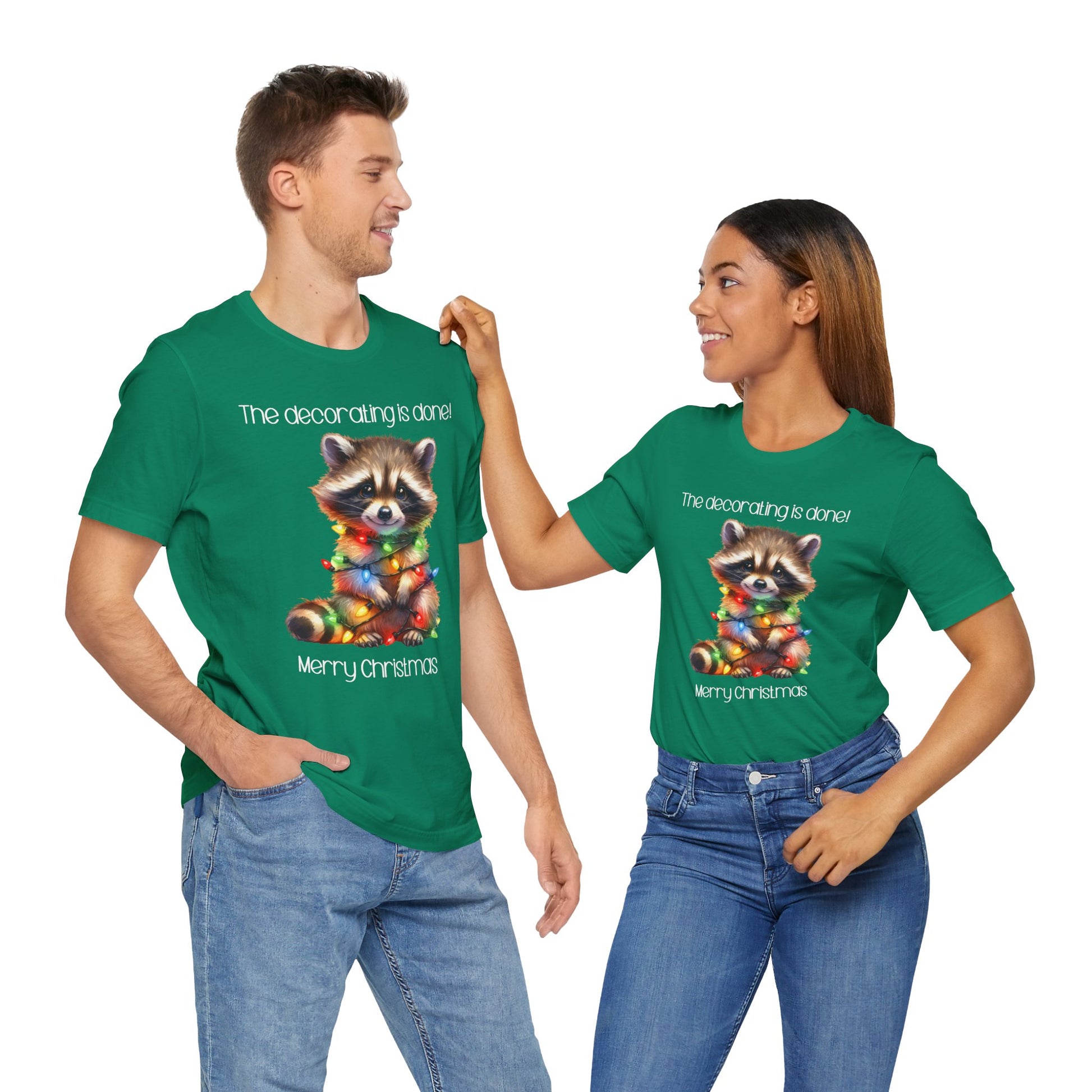 This funny tee shirt for Christmas states 'The decorating is done! Merry Christmas'. There is a raccoon wrapped in Christmas lights. It is just a cute tee shirt that shows the decorating is completed by the raccoon being decorated. A fun Christmas shirt for all.