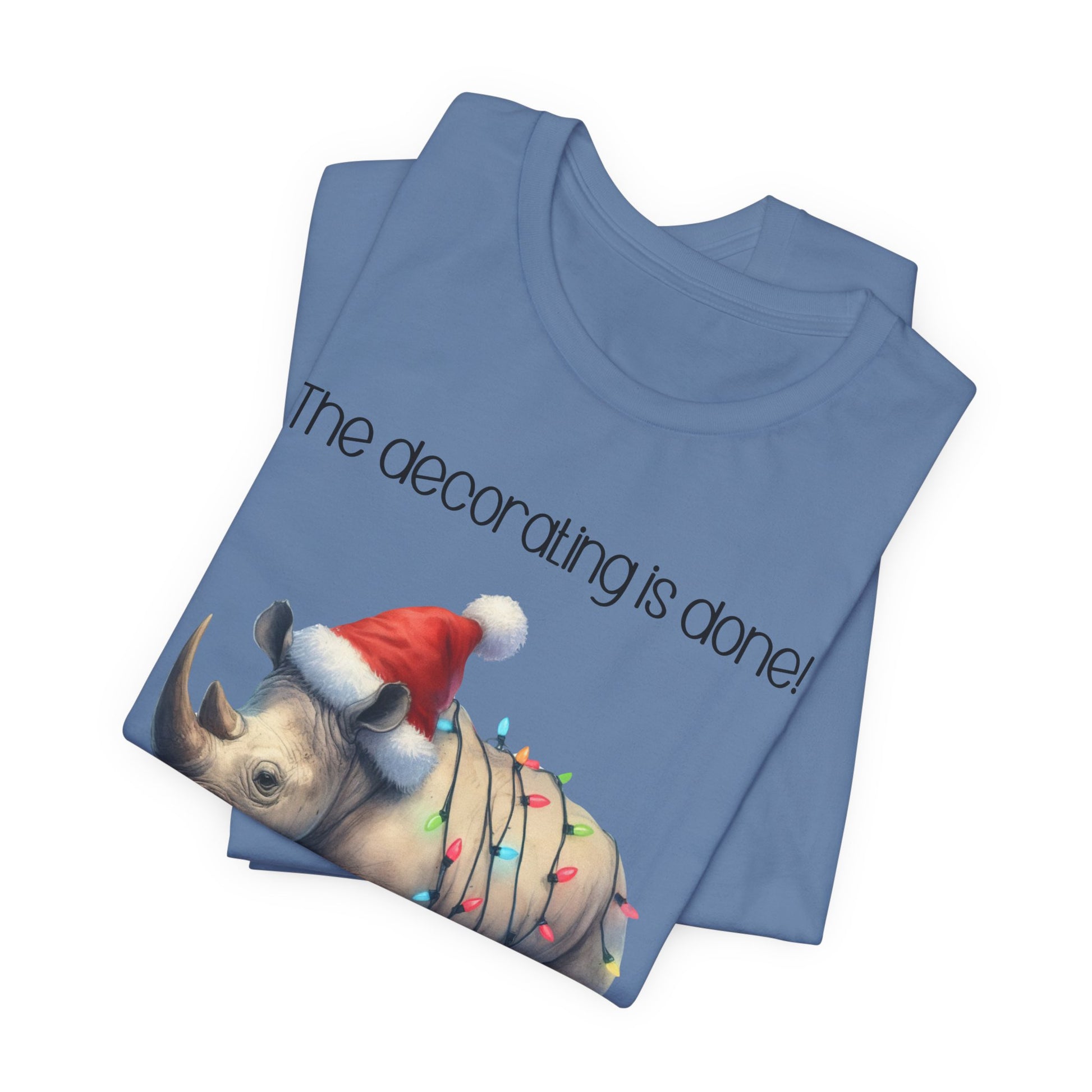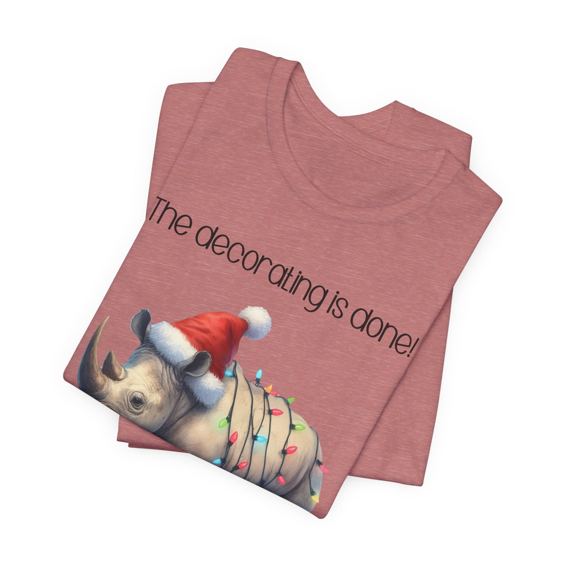 This funny tee shirt for Christmas states 'The decorating is done! Merry Christmas'. There is a rhinoceros wrapped in Christmas lights. It is just a cute tee shirt that shows the decorating is completed by the rhinoceros being decorated. A fun Christmas shirt for all.