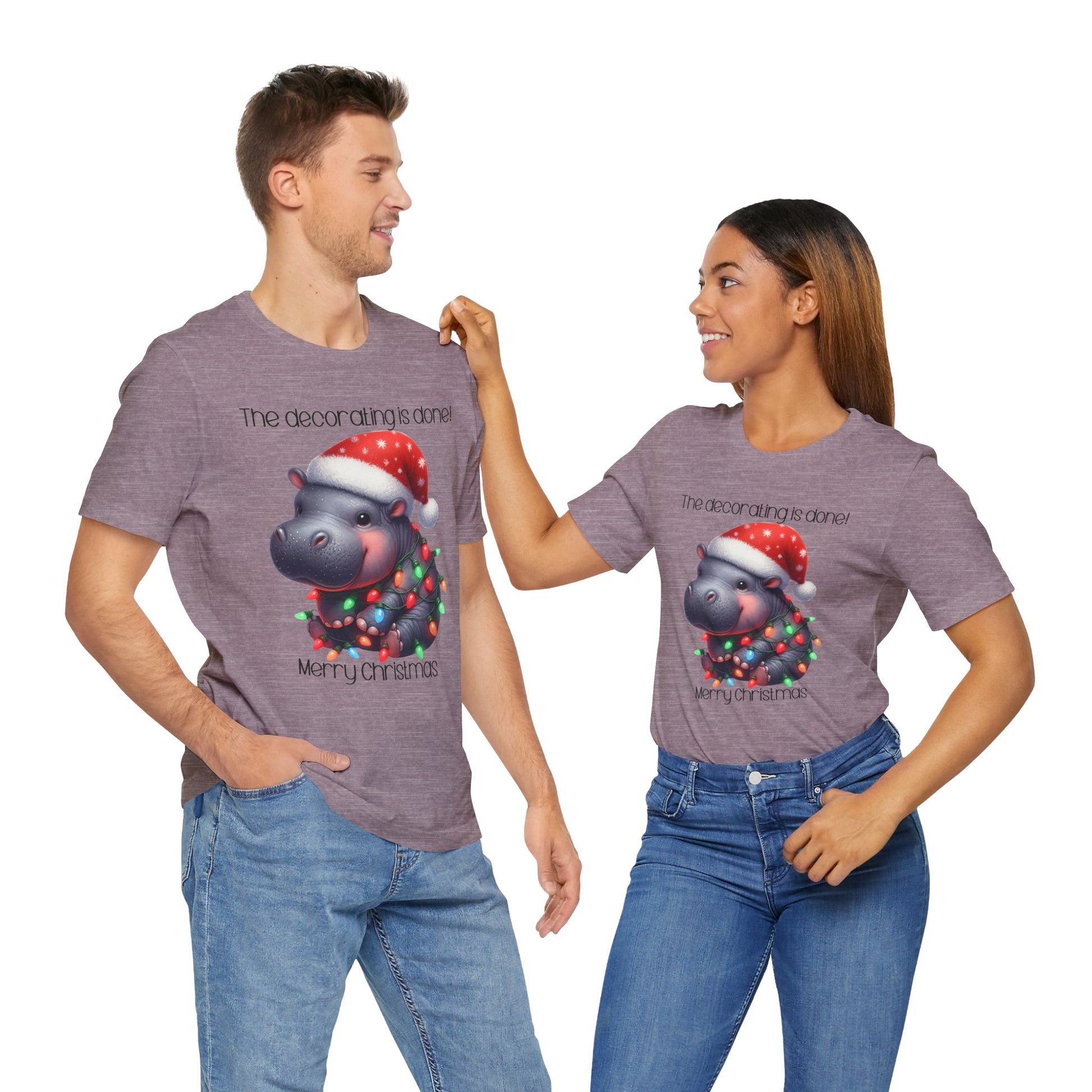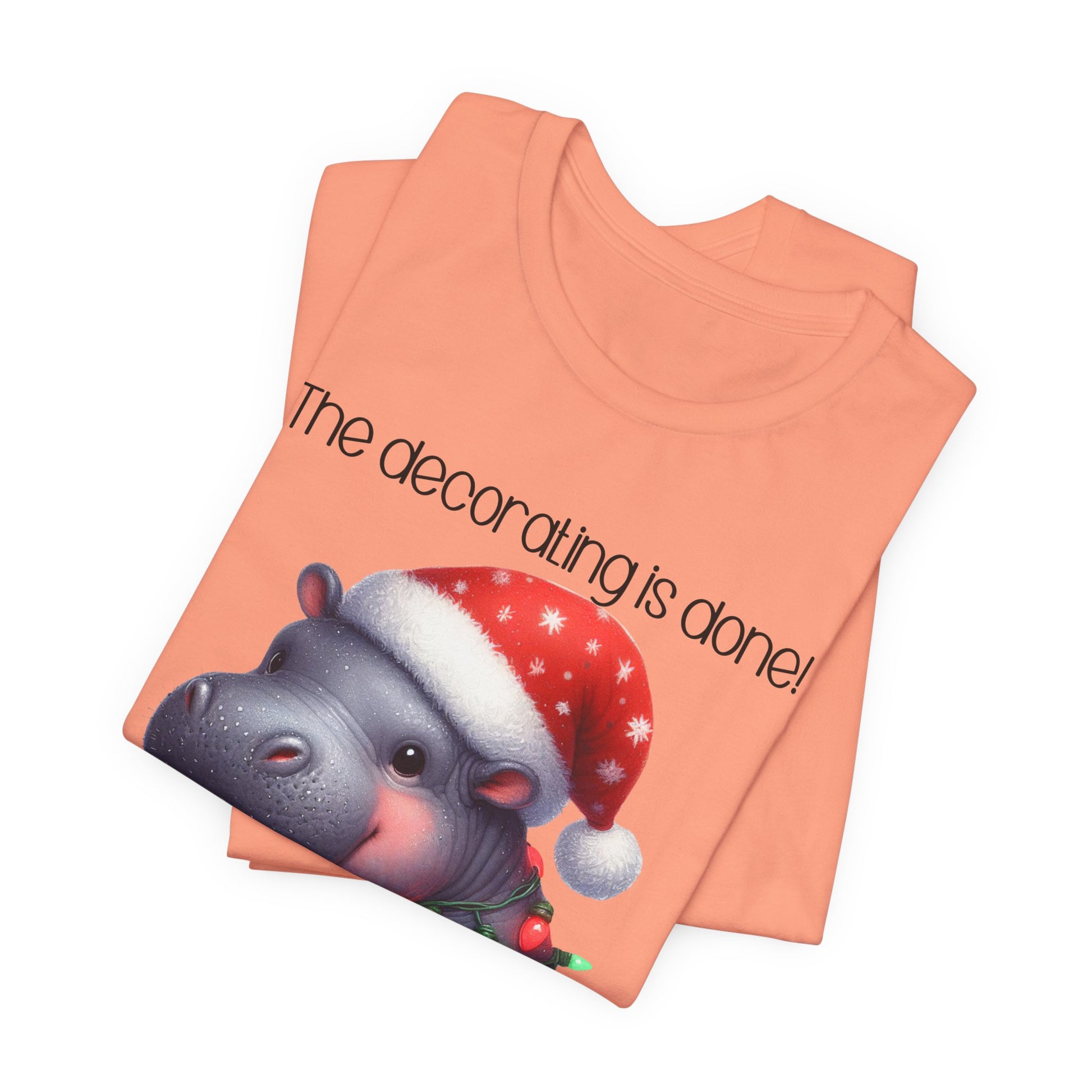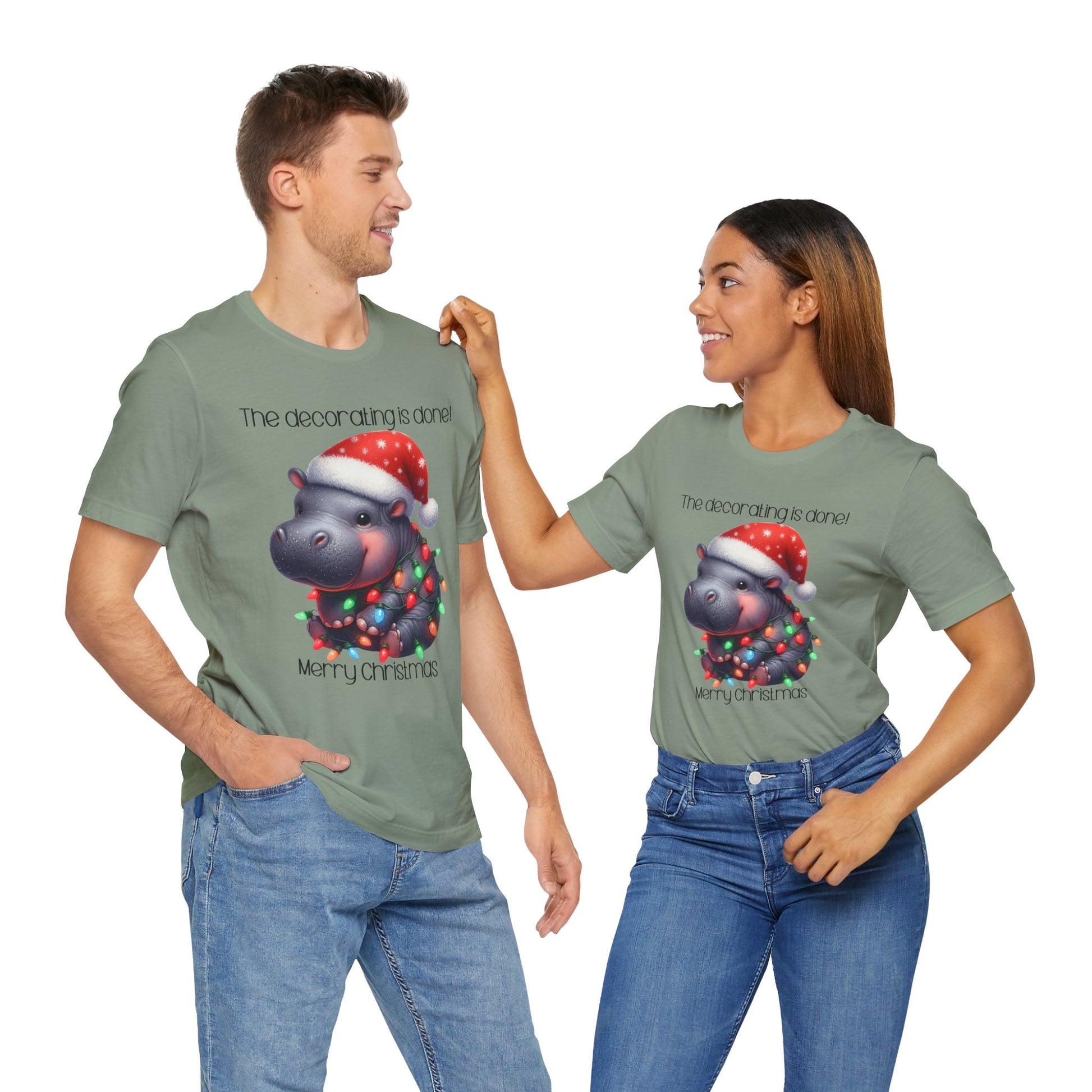 This funny tee shirt for Christmas states 'The decorating is done! Merry Christmas'. There is a hippopotamus wrapped in Christmas lights. It is just a cute tee shirt that shows the decorating is completed by the hippopotamus being decorated. A fun Christmas shirt for all.