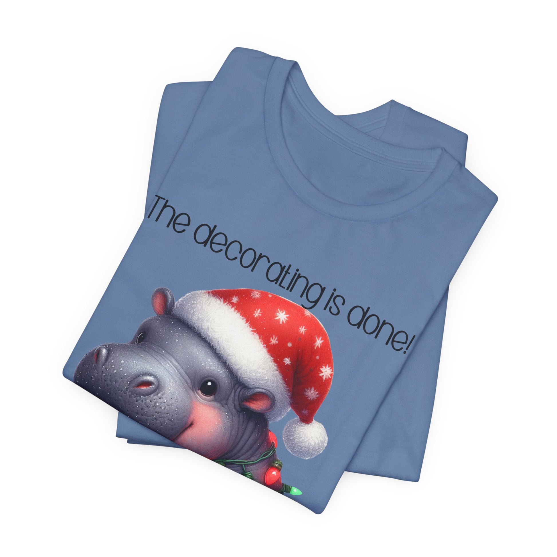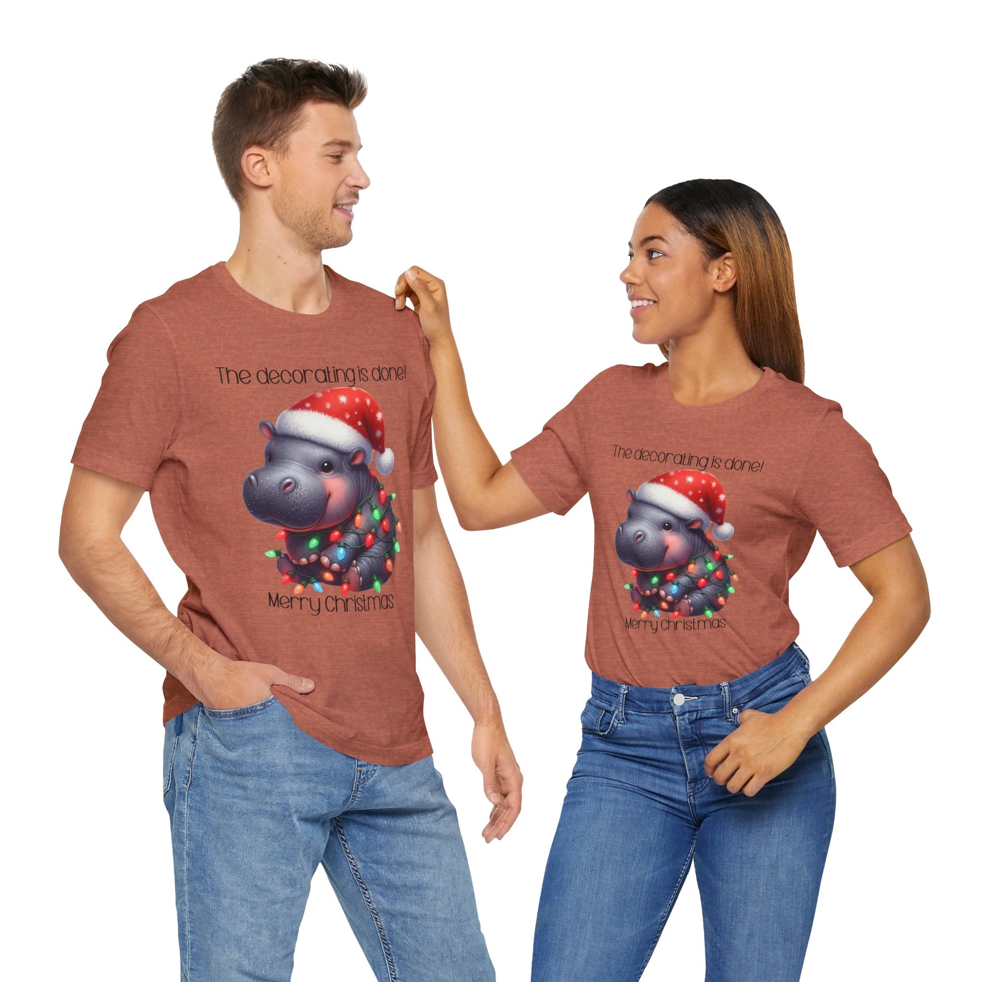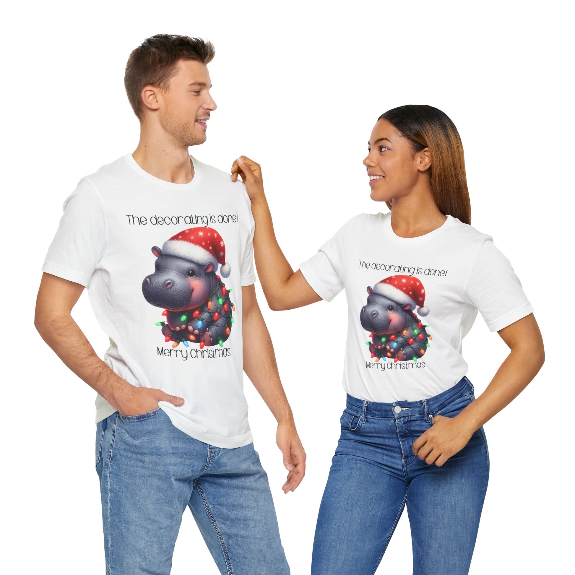 This funny tee shirt for Christmas states 'The decorating is done! Merry Christmas'. There is a hippopotamus wrapped in Christmas lights. It is just a cute tee shirt that shows the decorating is completed by the hippopotamus being decorated. A fun Christmas shirt for all.