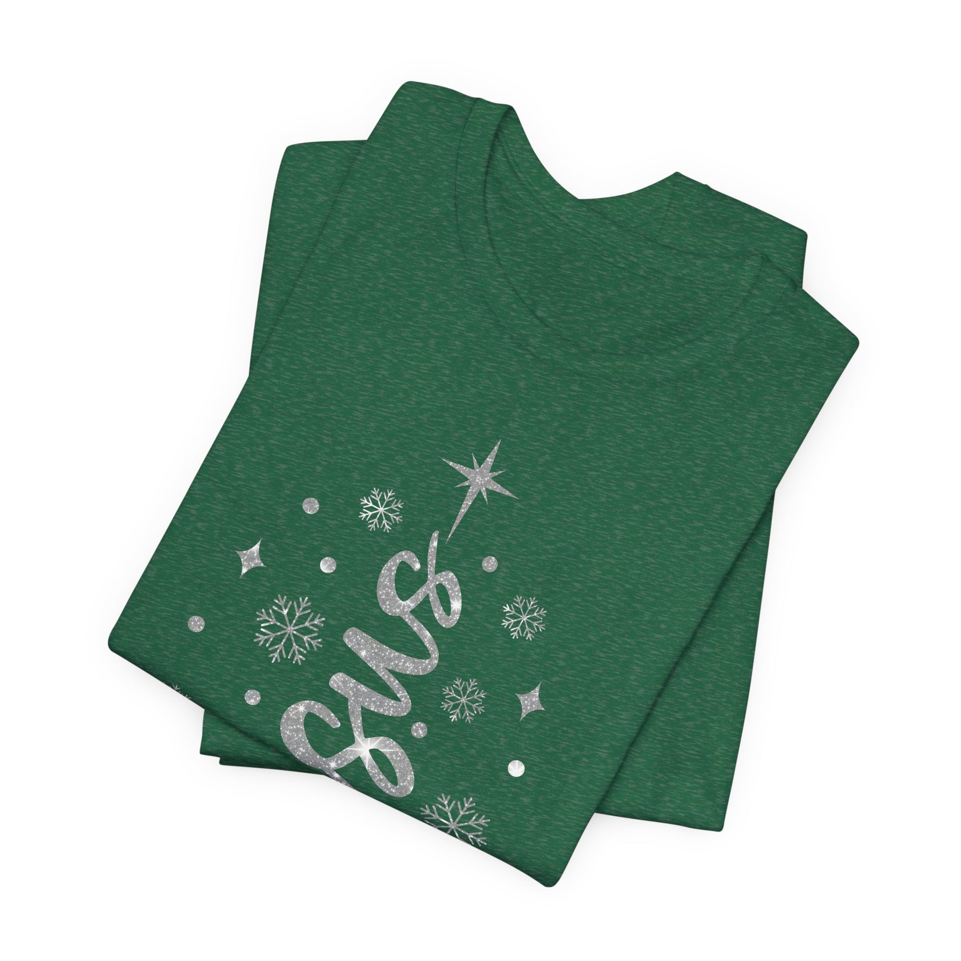 This basic tee with Jesus in a Christmas tree style that has the appearance of the silver hue glitter. A nice comfy shirt to layer or wear on its own for all you holiday events.