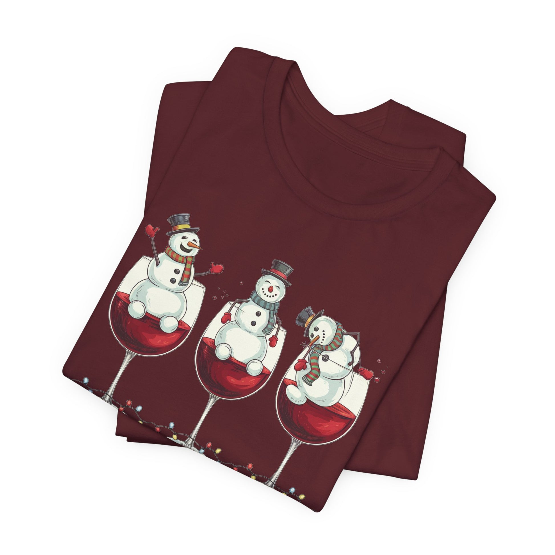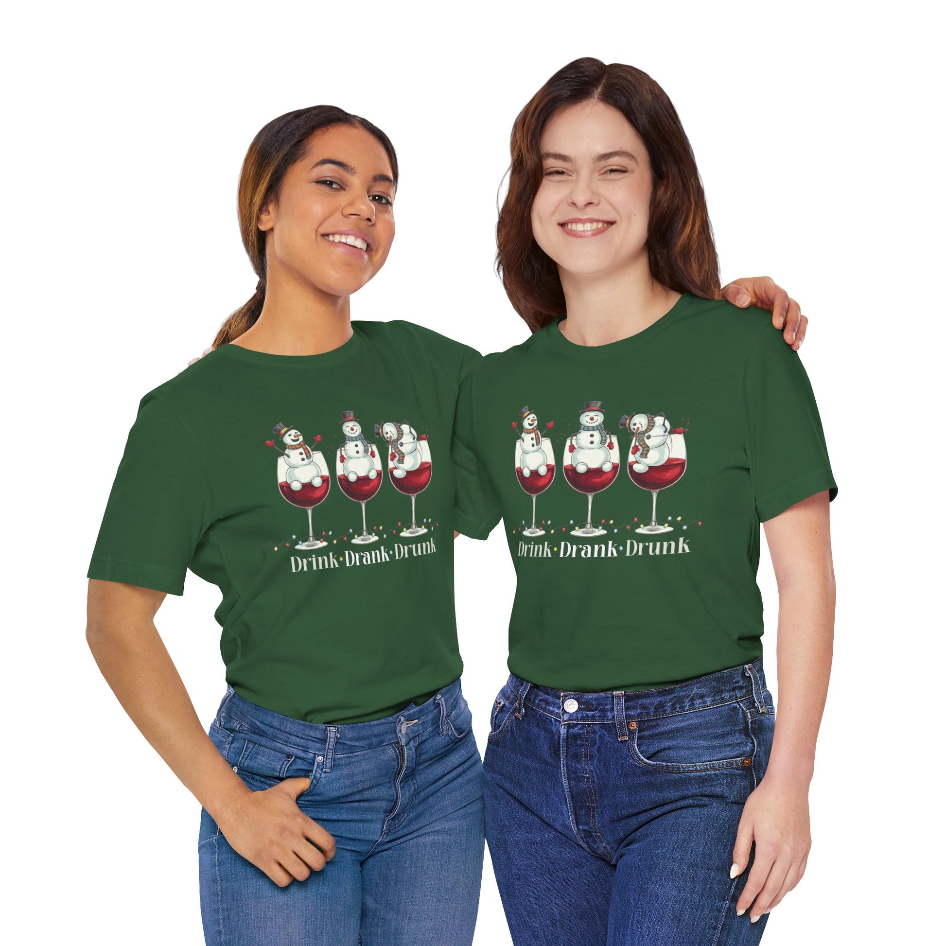 This funny Christmas wine tee shirt has three snowmen sitting in wine glasses with 'Drink, Drank, Drunk' written under eat snowman. It is just a fun Christmas tee shirt.