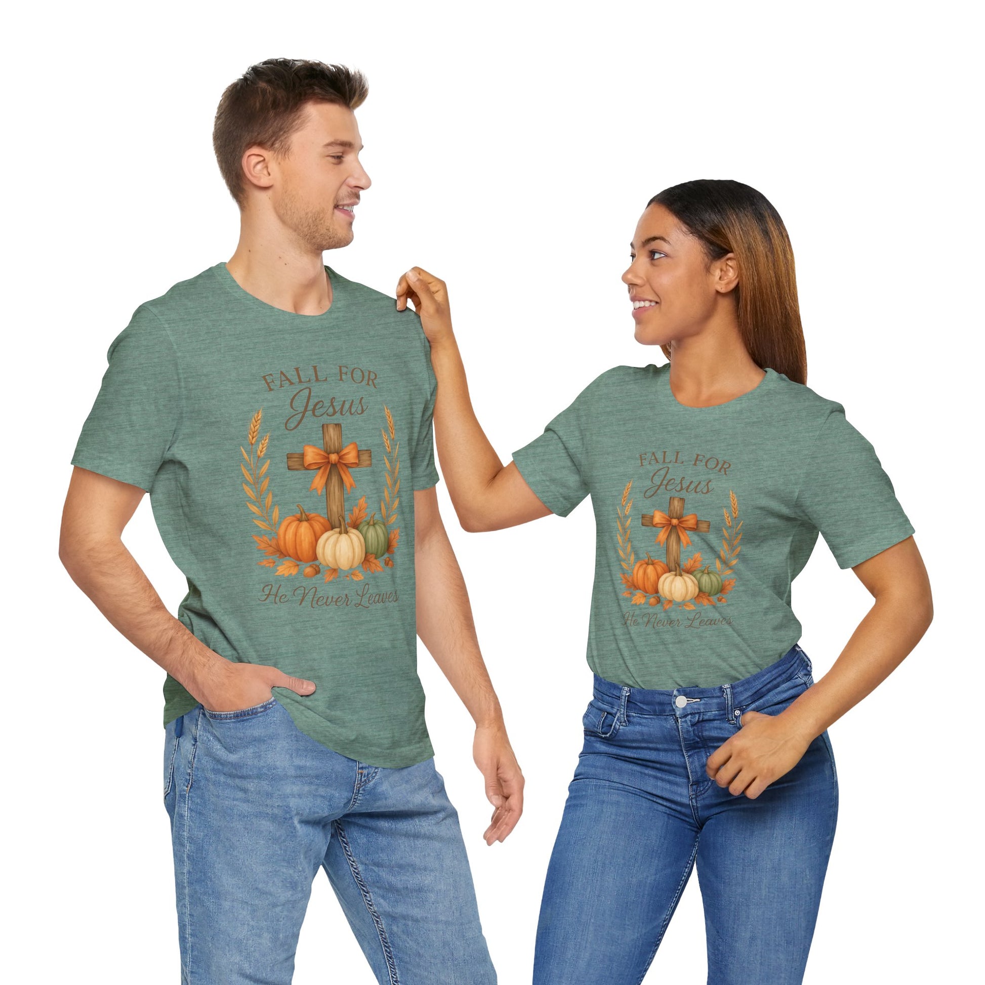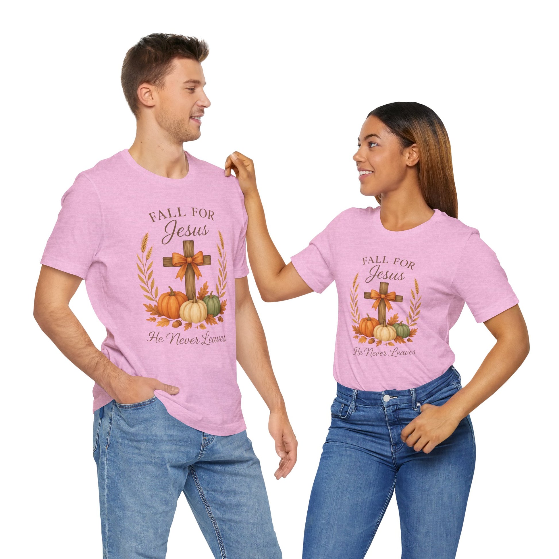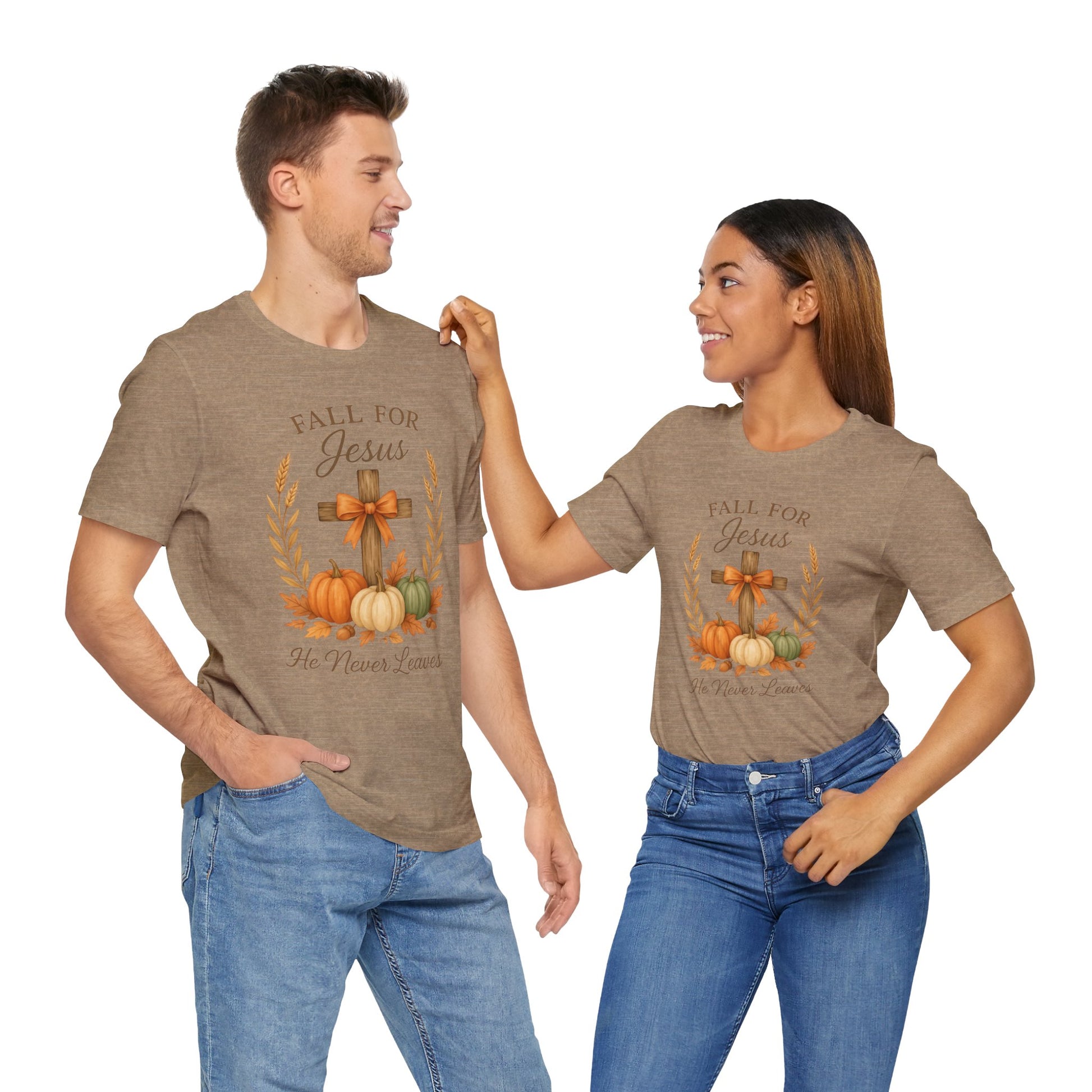 Faith-based t-shirt featuring 'Fall for Jesus, he never leaves' with a cross, some pumpkins and leaves. Perfect for any events that you want to show off pride in your faith. The graphic is simple but the message is powerful. Makes a great gift idea for all occasions, relevant for celebrations. Ideal for adults who want to showcase their faith in a stylish and comfortable way.