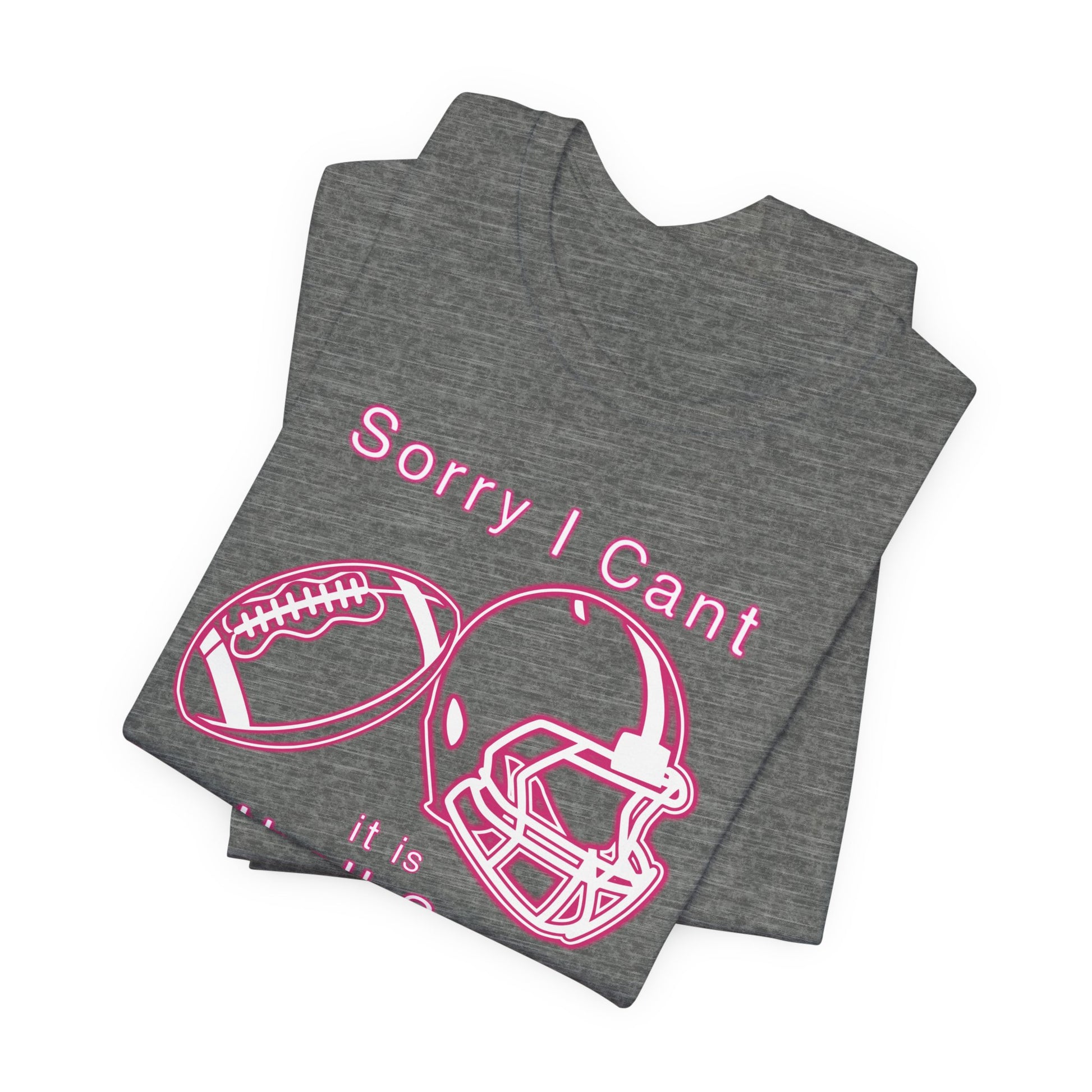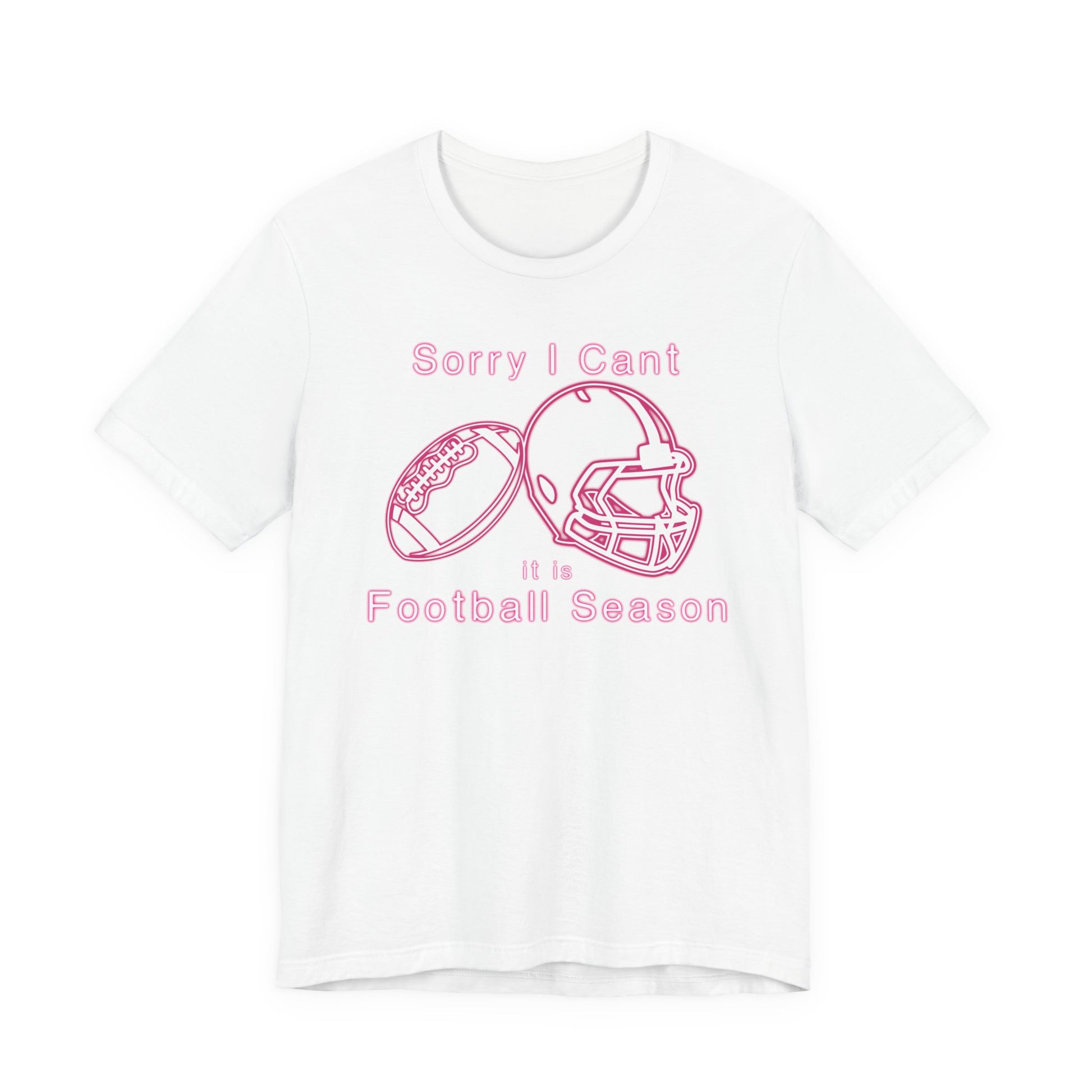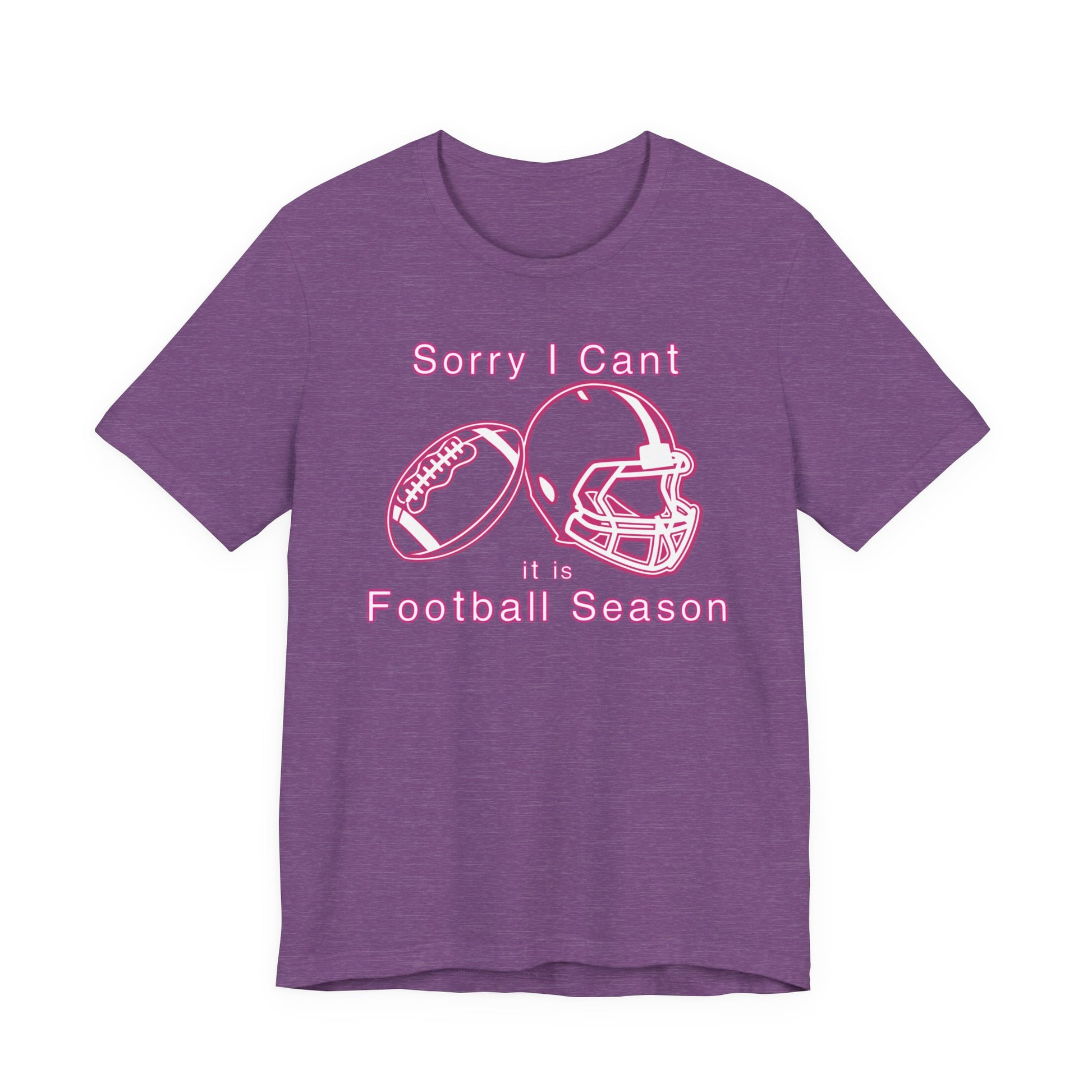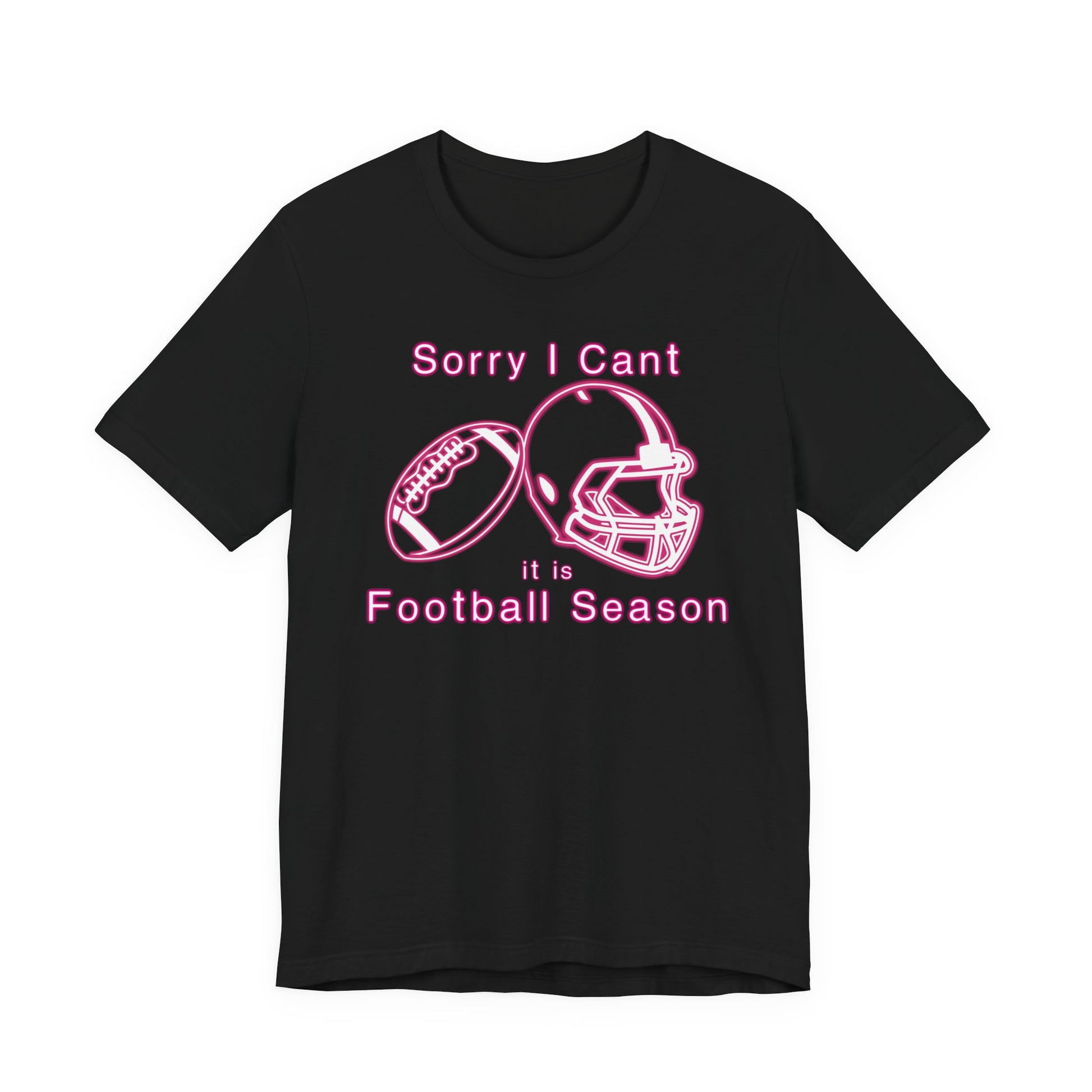 This comfortable tee sporting a pink neon football with helmet. Stating 'Sorry I can't, it is football season'. It is is an ideal shirt for any time being spent watching good football games.