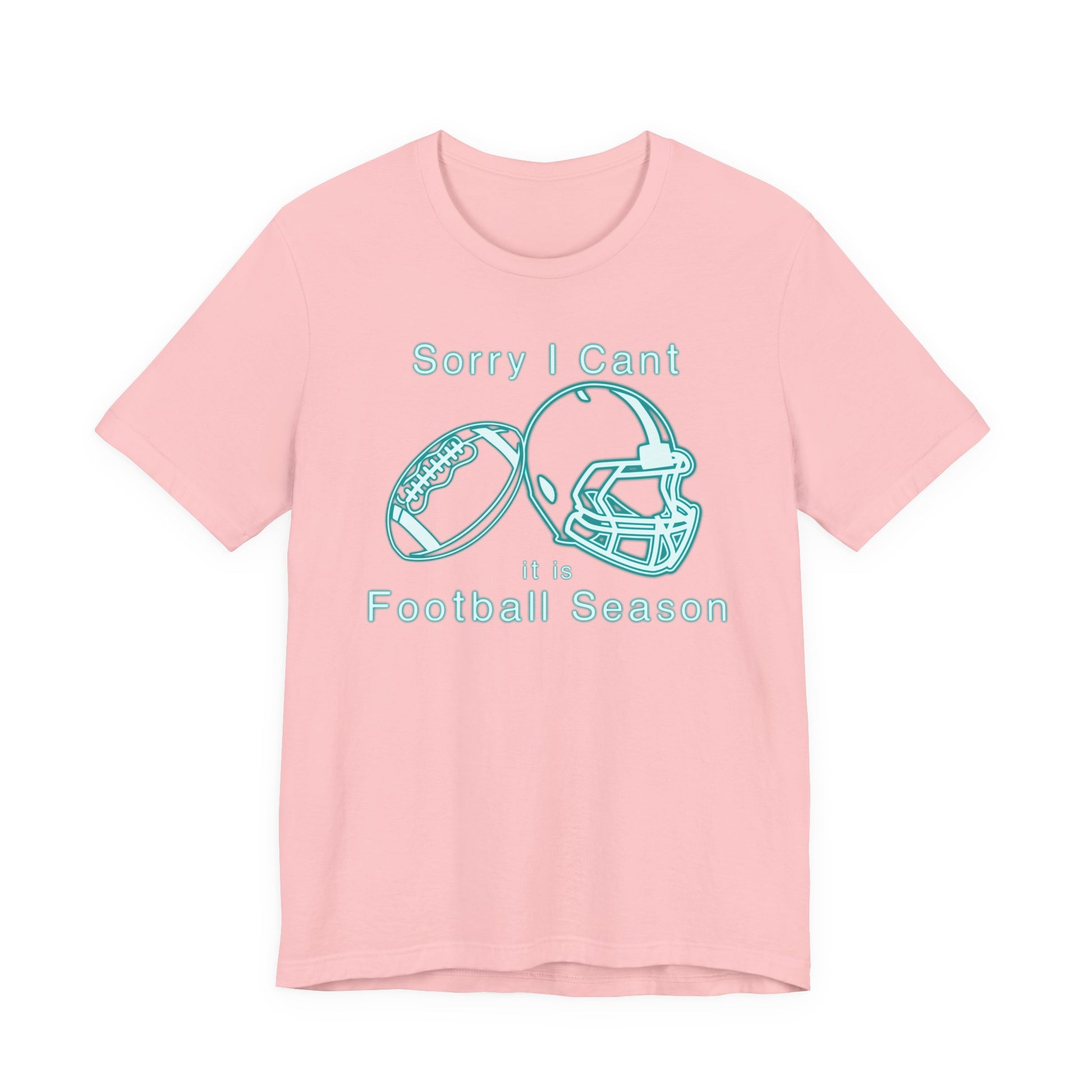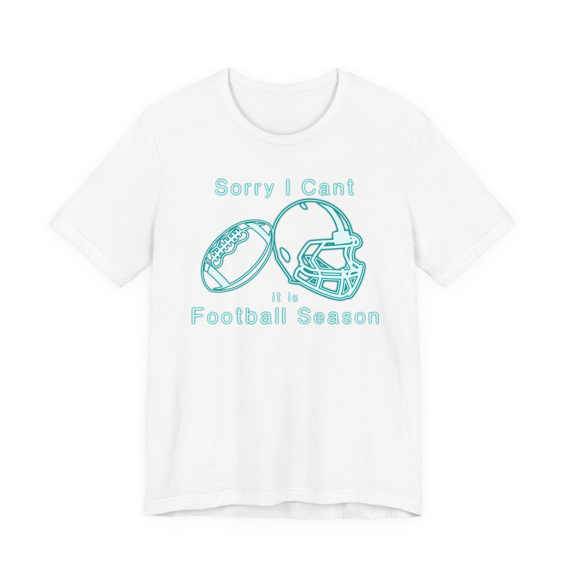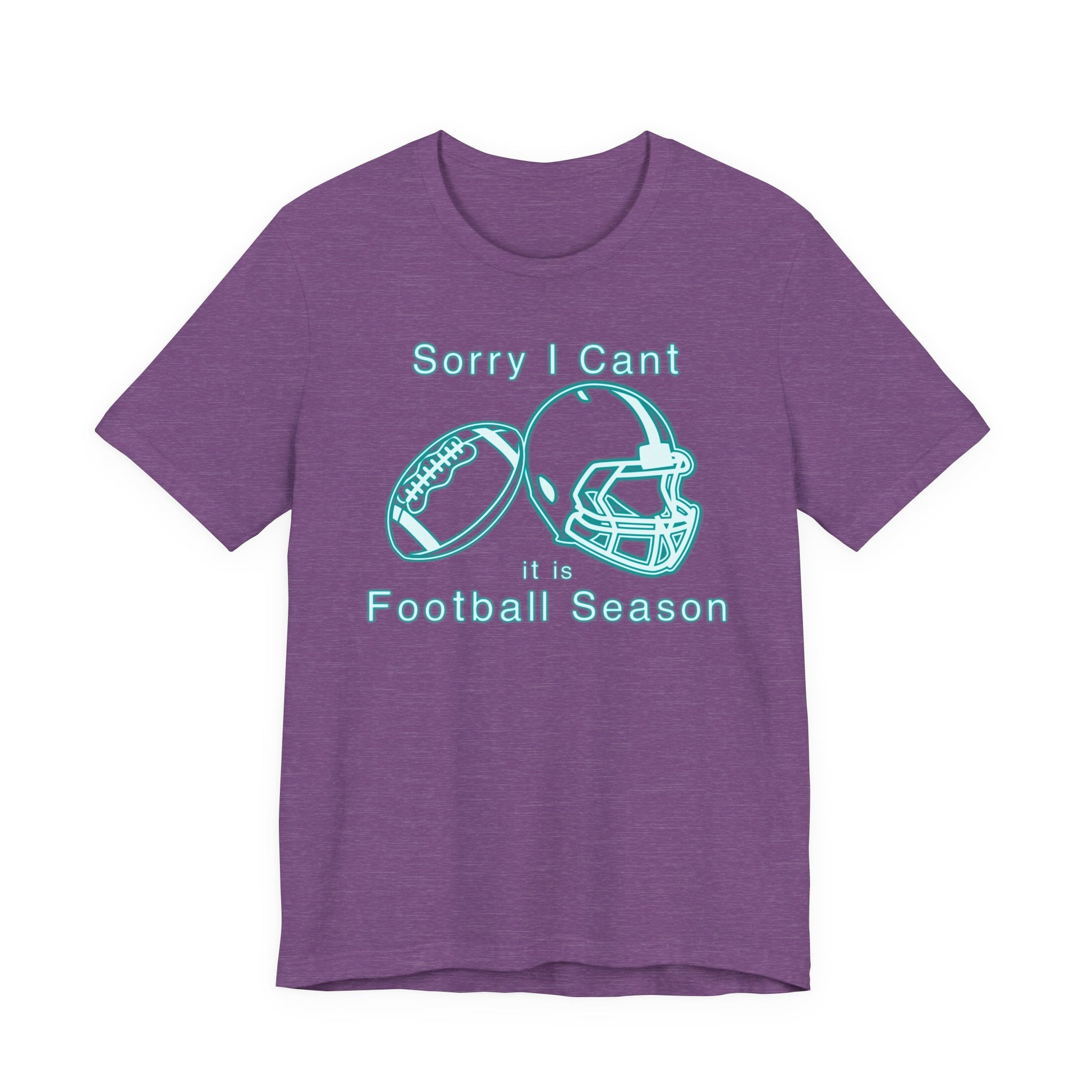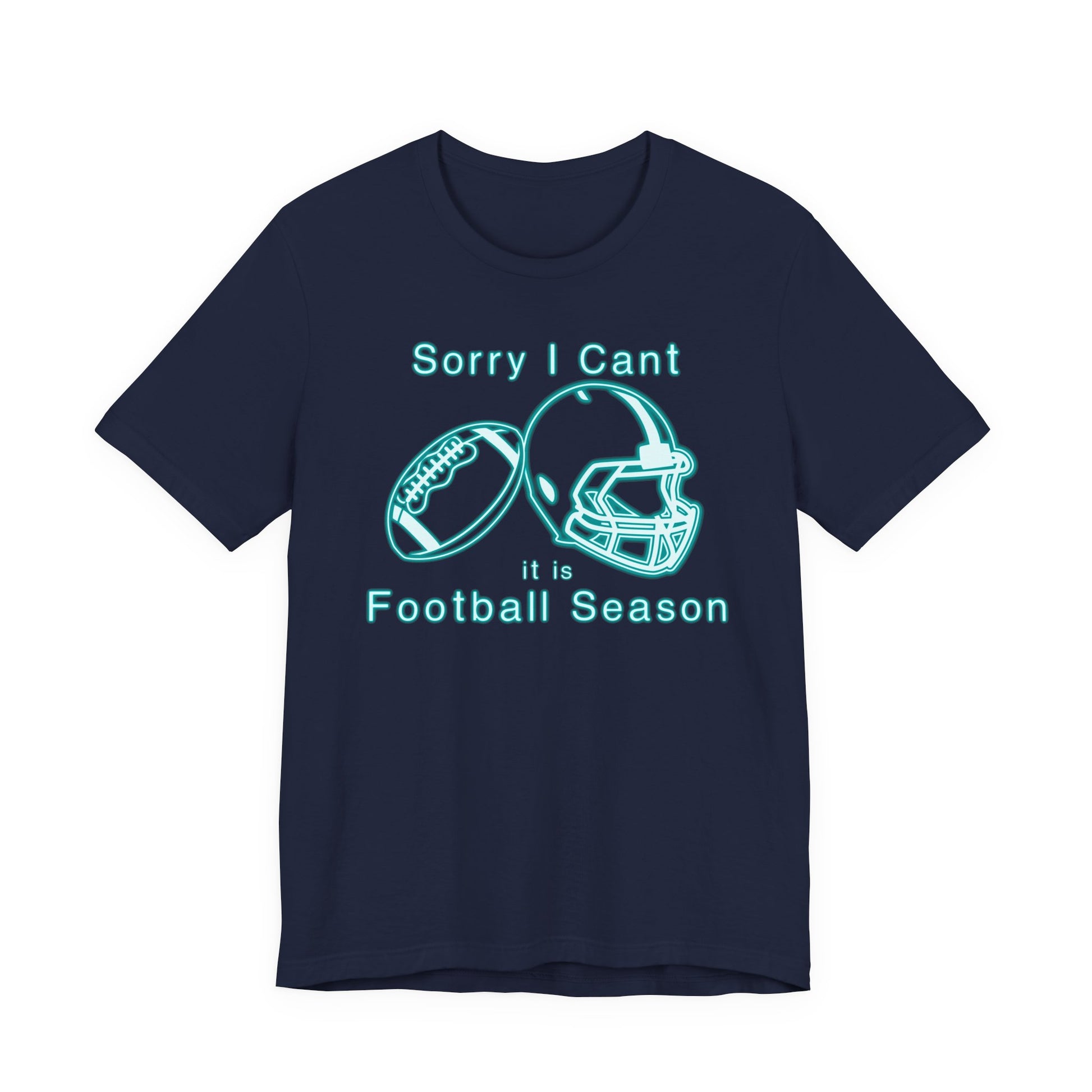 This comfortable tee sporting a teal neon football with helmet. Stating 'Sorry I can't, it is football season'. It is is an ideal shirt for any time being spent watching good football games.