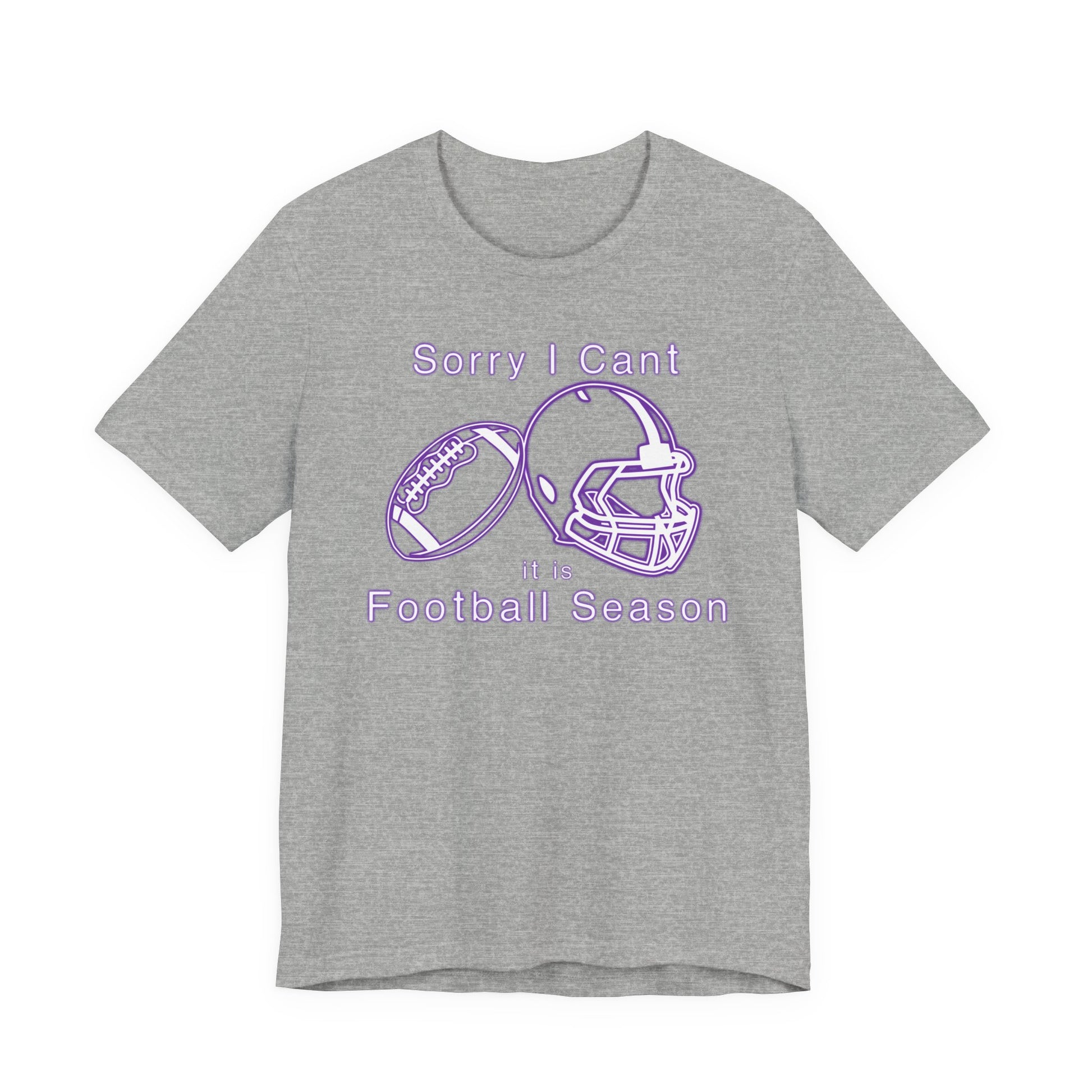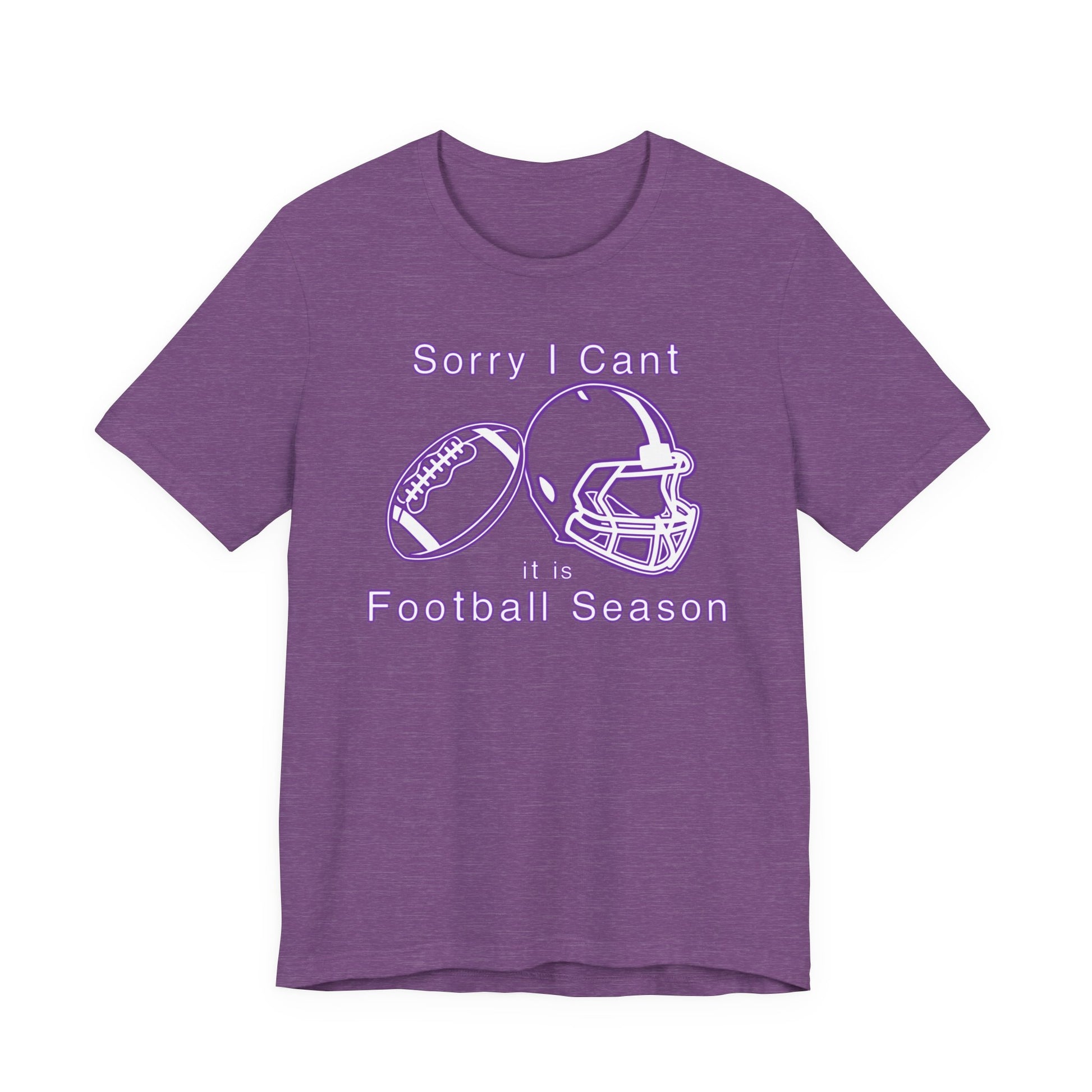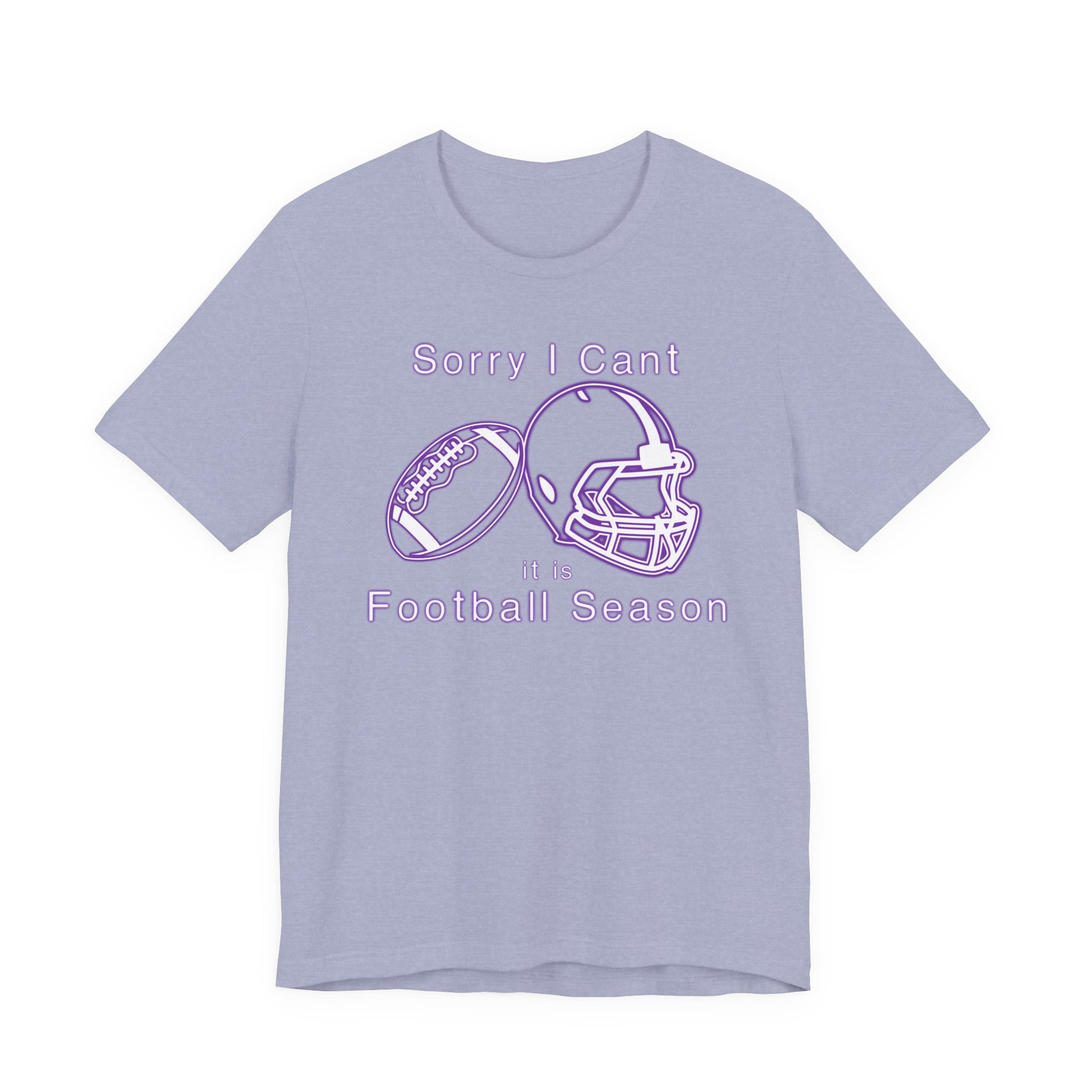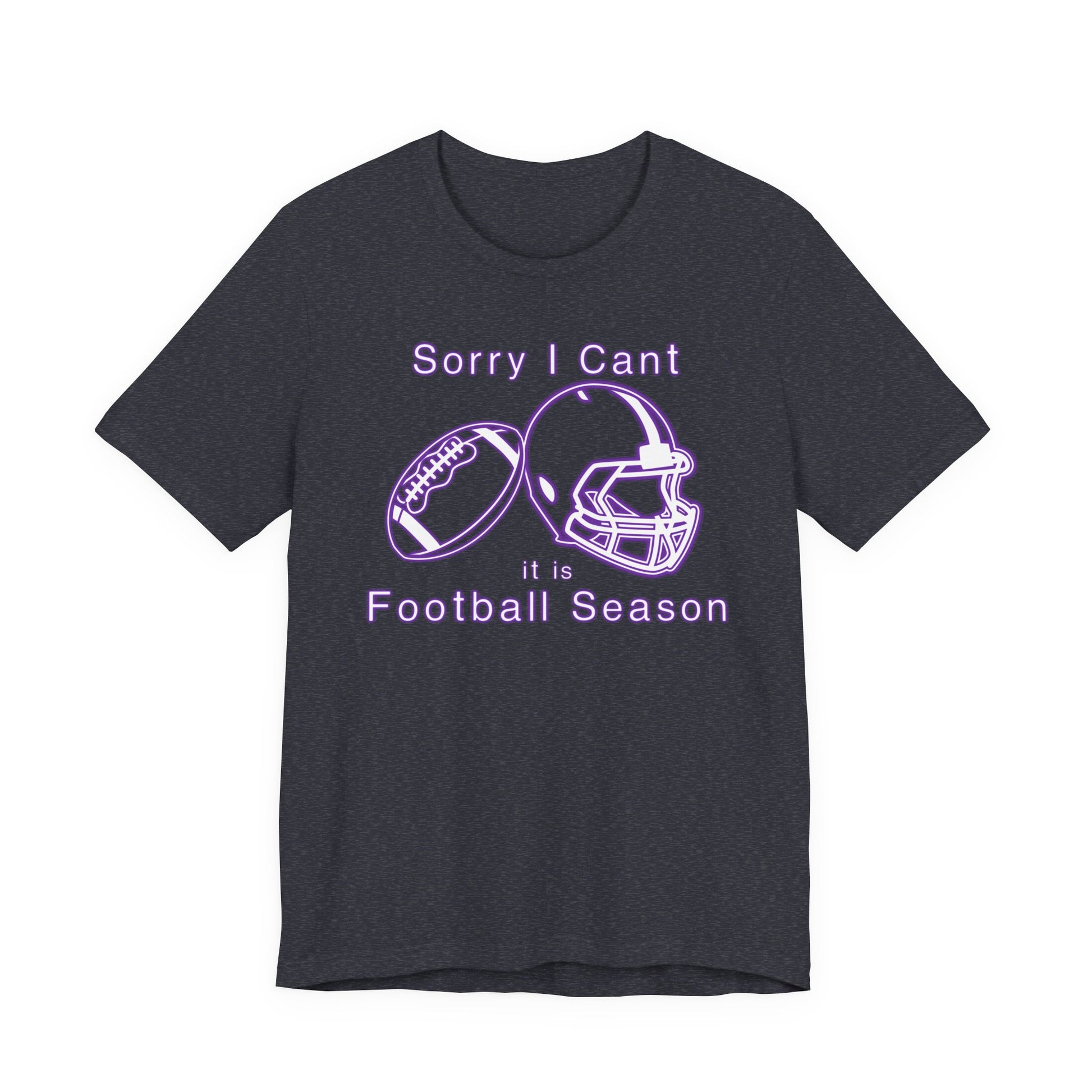 This comfortable tee sporting a purple neon football with helmet. Stating 'Sorry I can't, it is football season'. It is is an ideal shirt for any time being spent watching good football games.