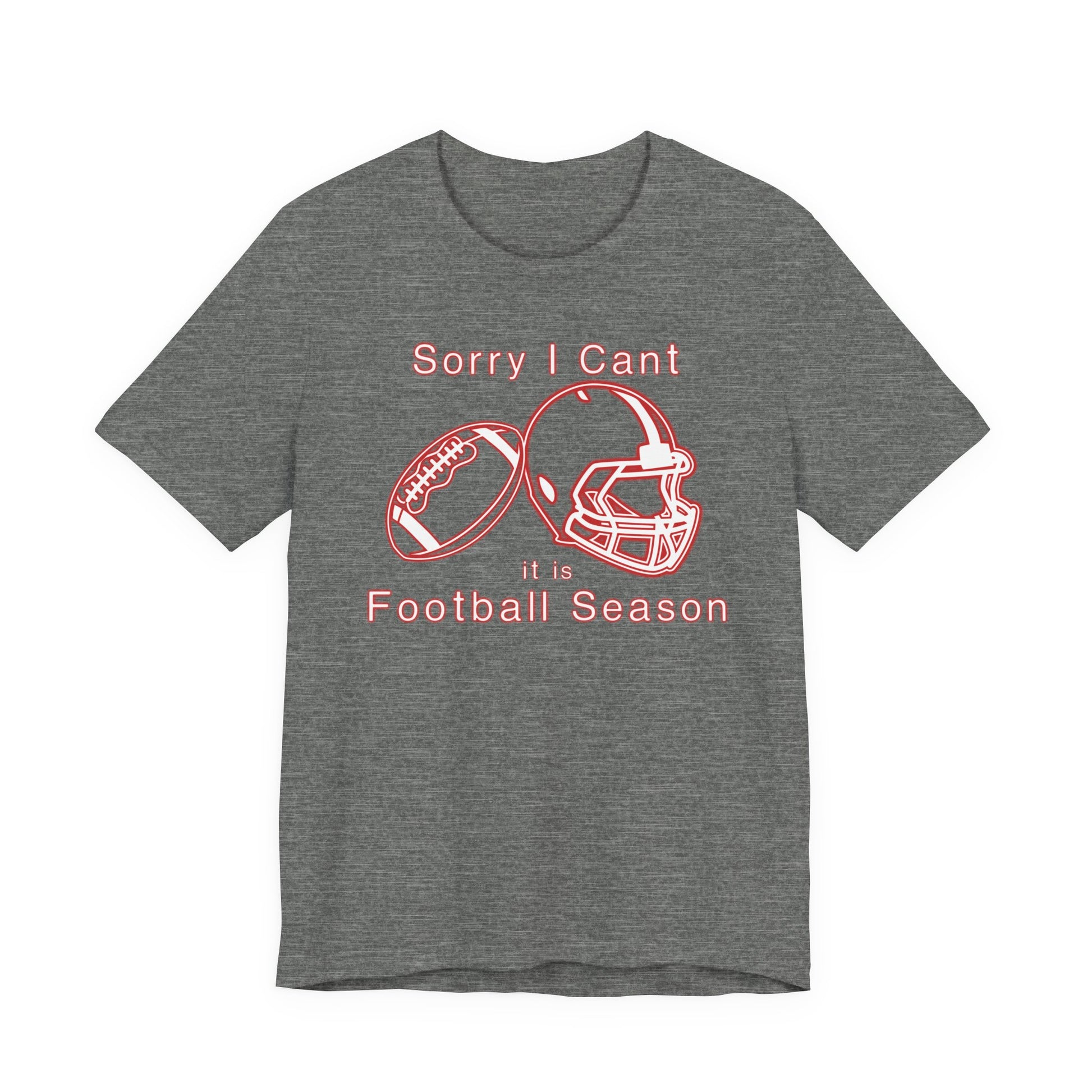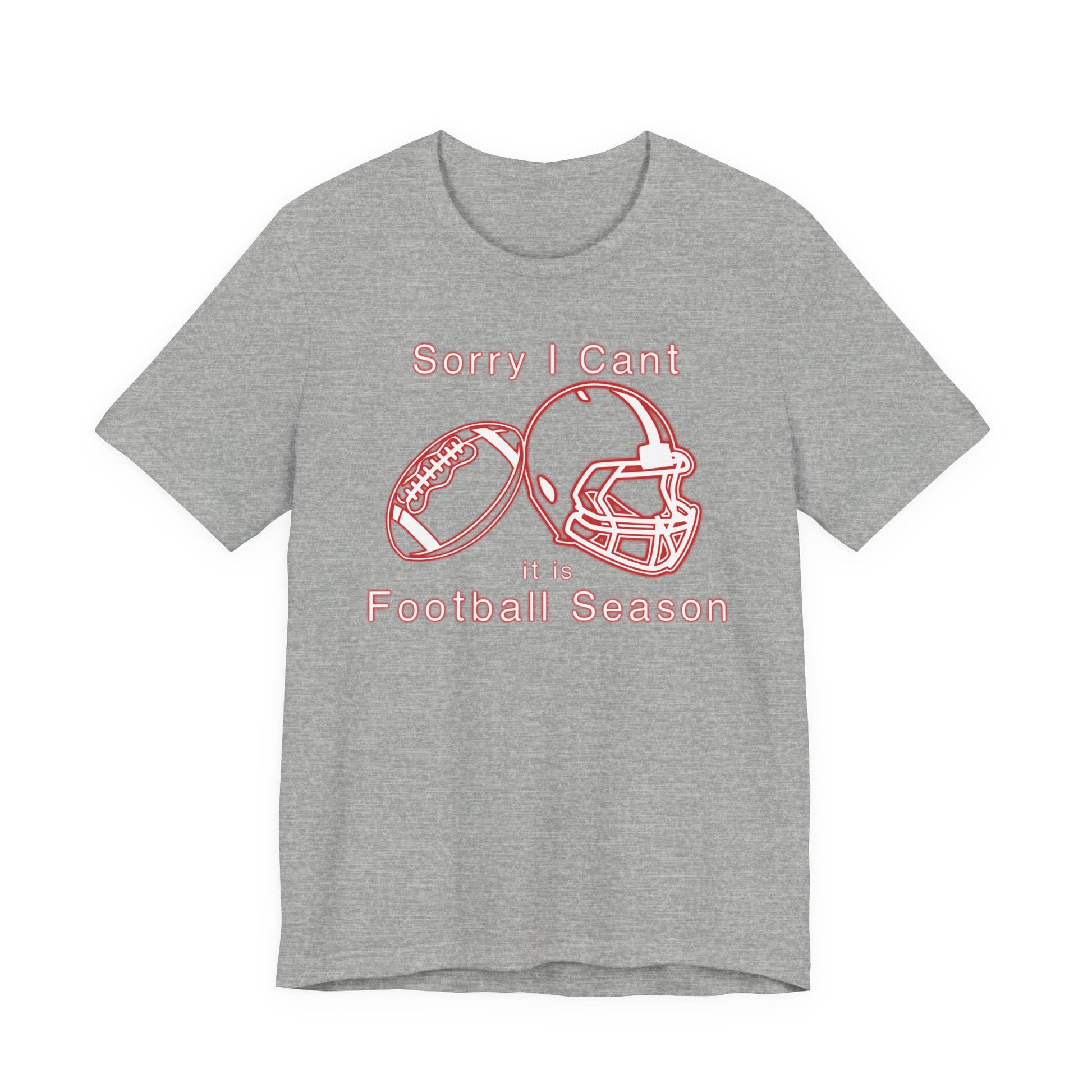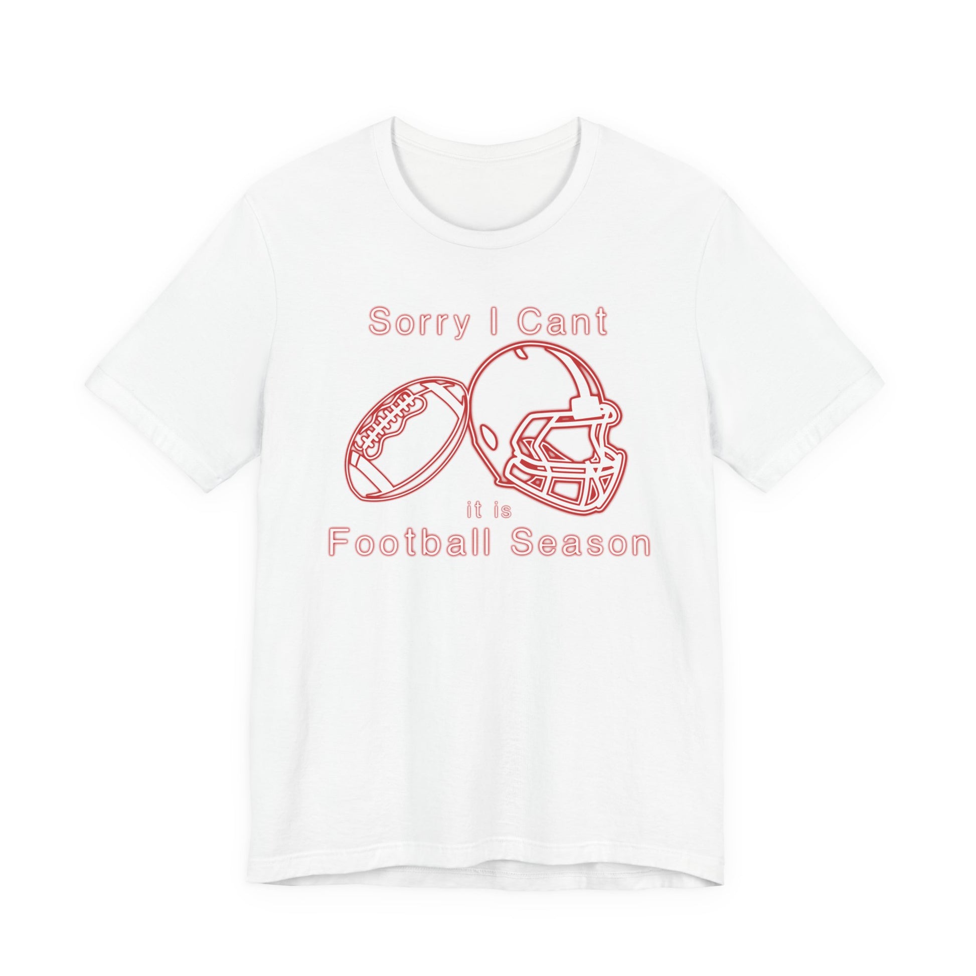 This comfortable tee sporting a red neon football with helmet. Stating 'Sorry I can't, it is football season'. It is is an ideal shirt for any time being spent watching good football games.