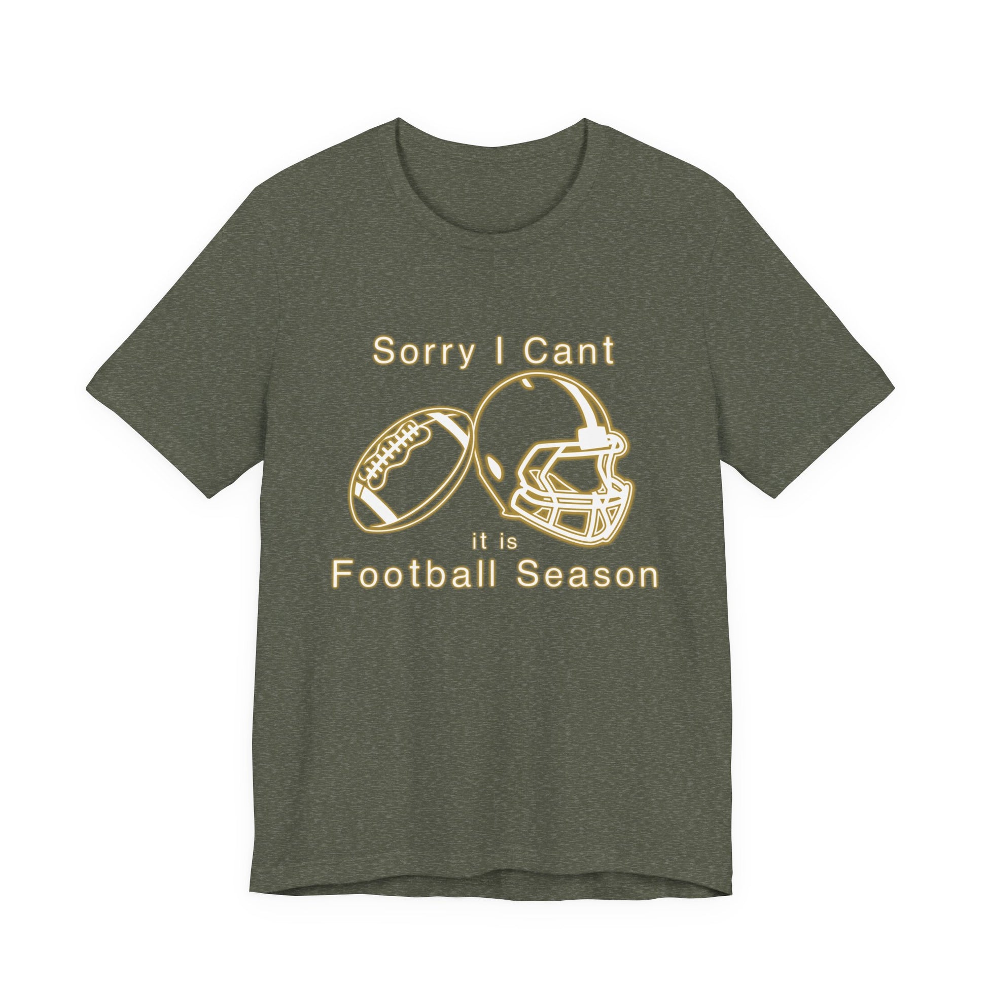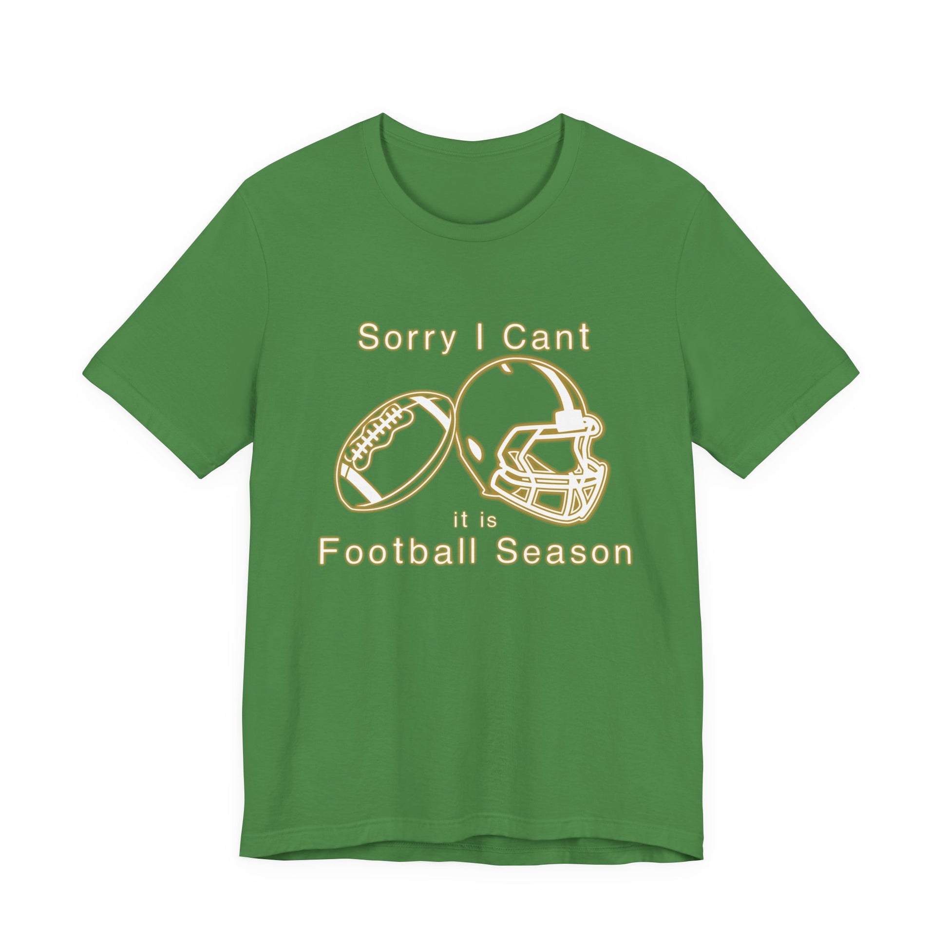 This comfortable tee sporting a gold neon football with helmet. Stating 'Sorry I can't, it is football season'. It is is an ideal shirt for any time being spent watching good football games.
