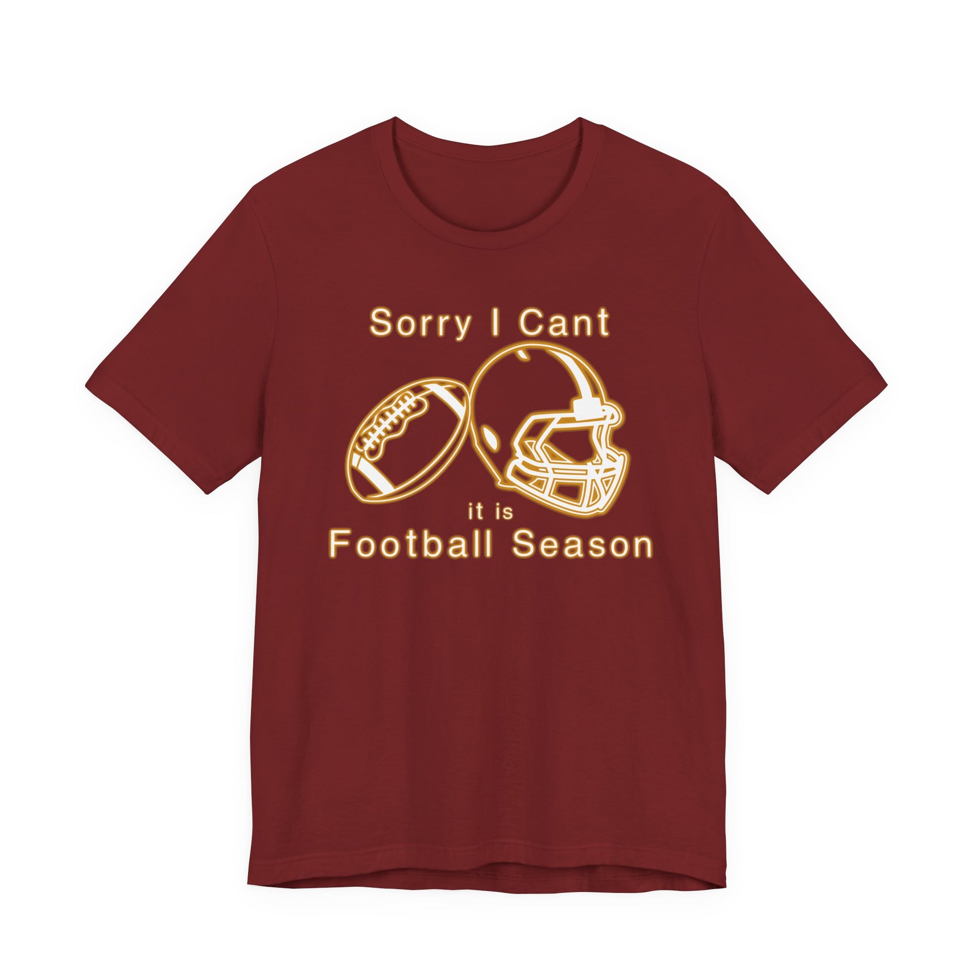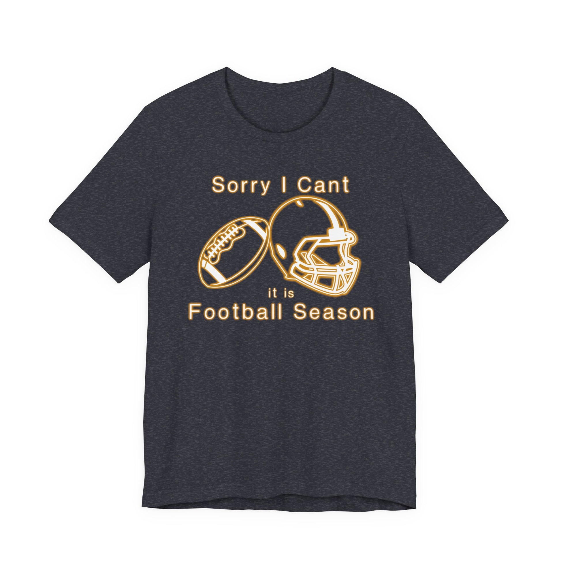 This comfortable tee sporting a orange neon football with helmet. Stating 'Sorry I can't, it is football season'. It is is an ideal shirt for any time being spent watching good football games.