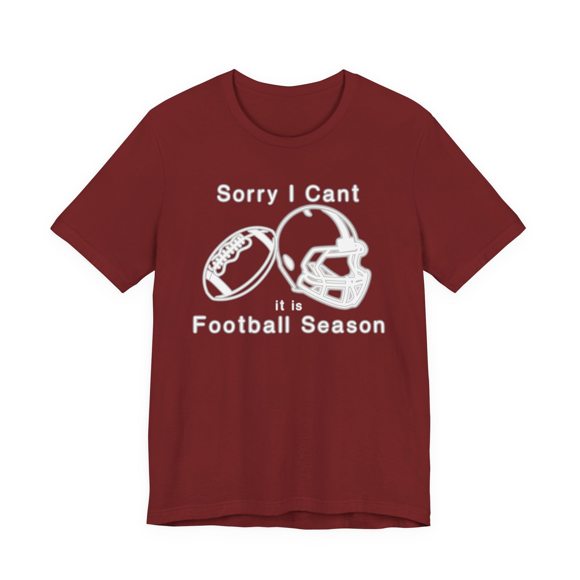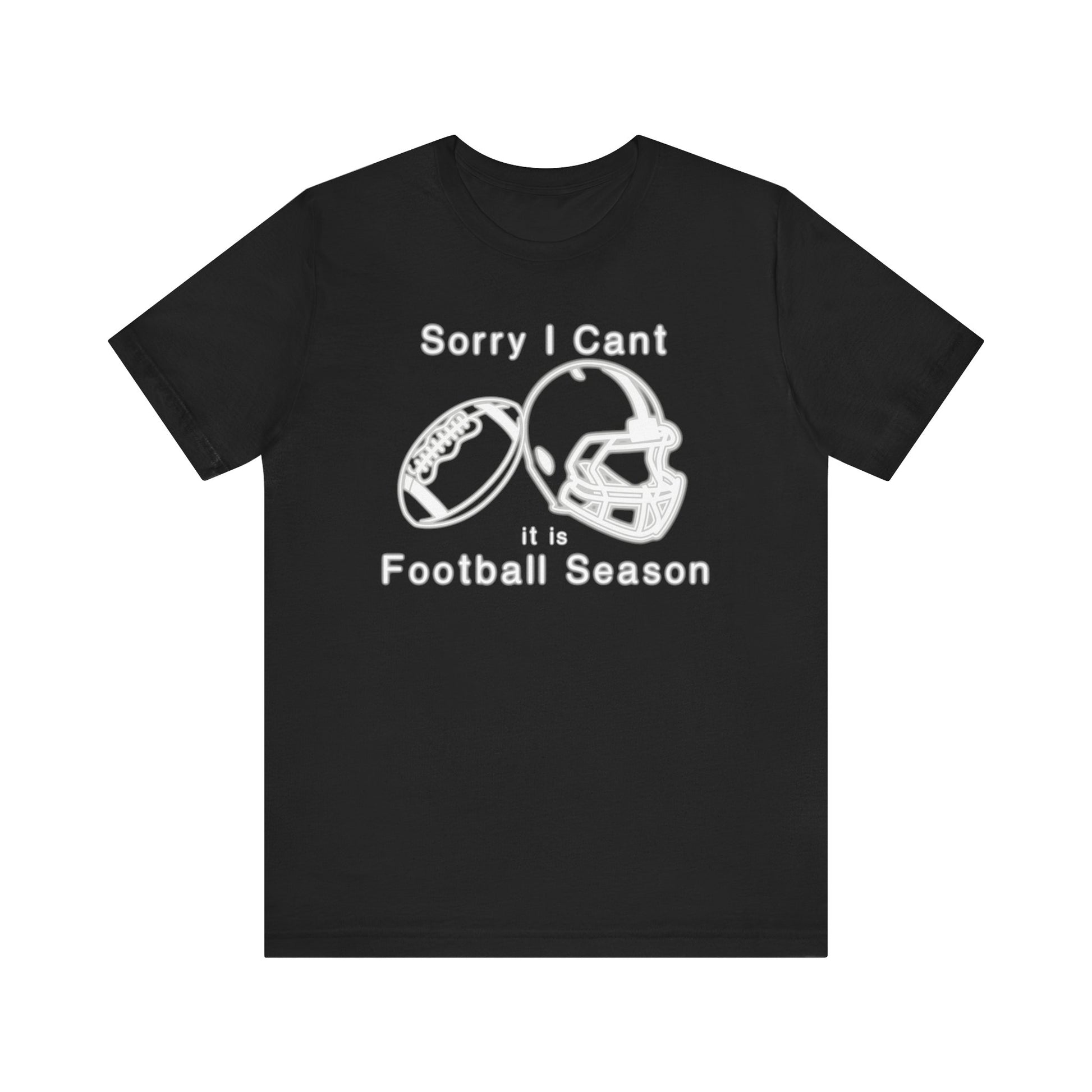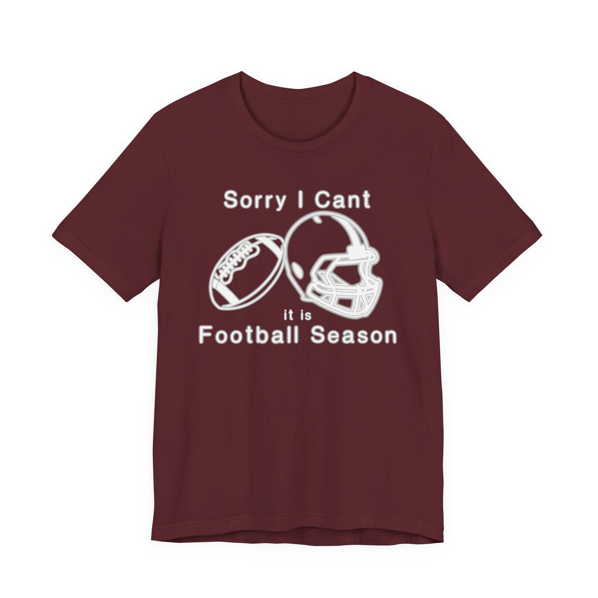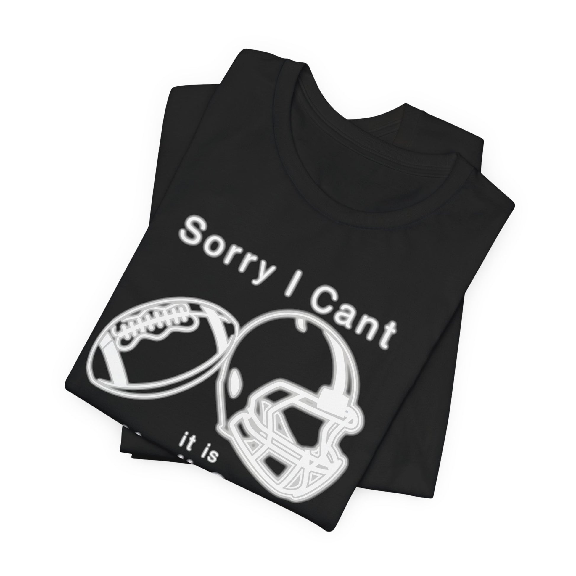 This comfortable tee sporting a white neon football with helmet. Stating 'Sorry I can't, it is football season'. It is is an ideal shirt for any time being spent watching good football games.