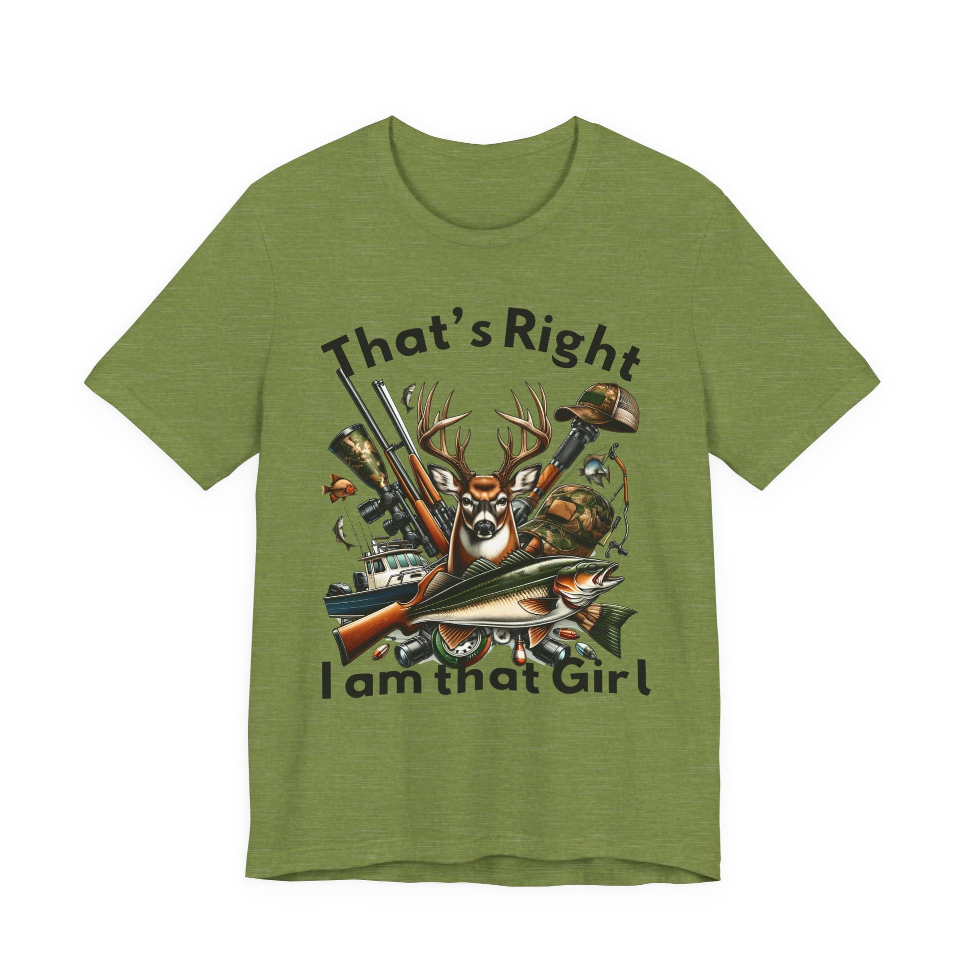 This tee features a quote 'That's right, I am that Girl' in black font including a collection of hunting and fishing items, it is ideal for outdoor enthusiasts whom love hunting and fishing. It a great addition to show off your style and your hunting enthusiast at casual outings, gatherings with friends, or simply lounging at home.