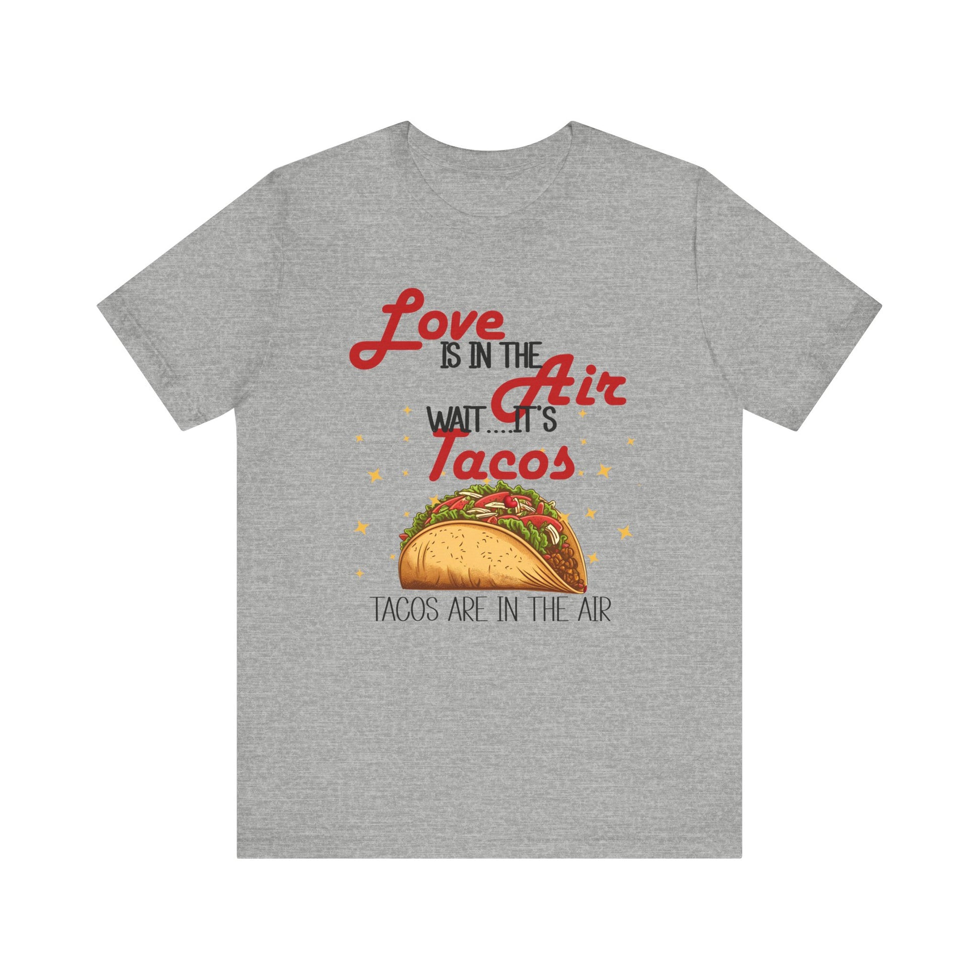 This hilarious graphic T-shirt is perfect for bringing smiles and humor to Valentine's Day and beyond. It features a playful design stating 'Love is in the Air, Wait It's Taco's, Taco's are in the air' with a happy taco graphic.