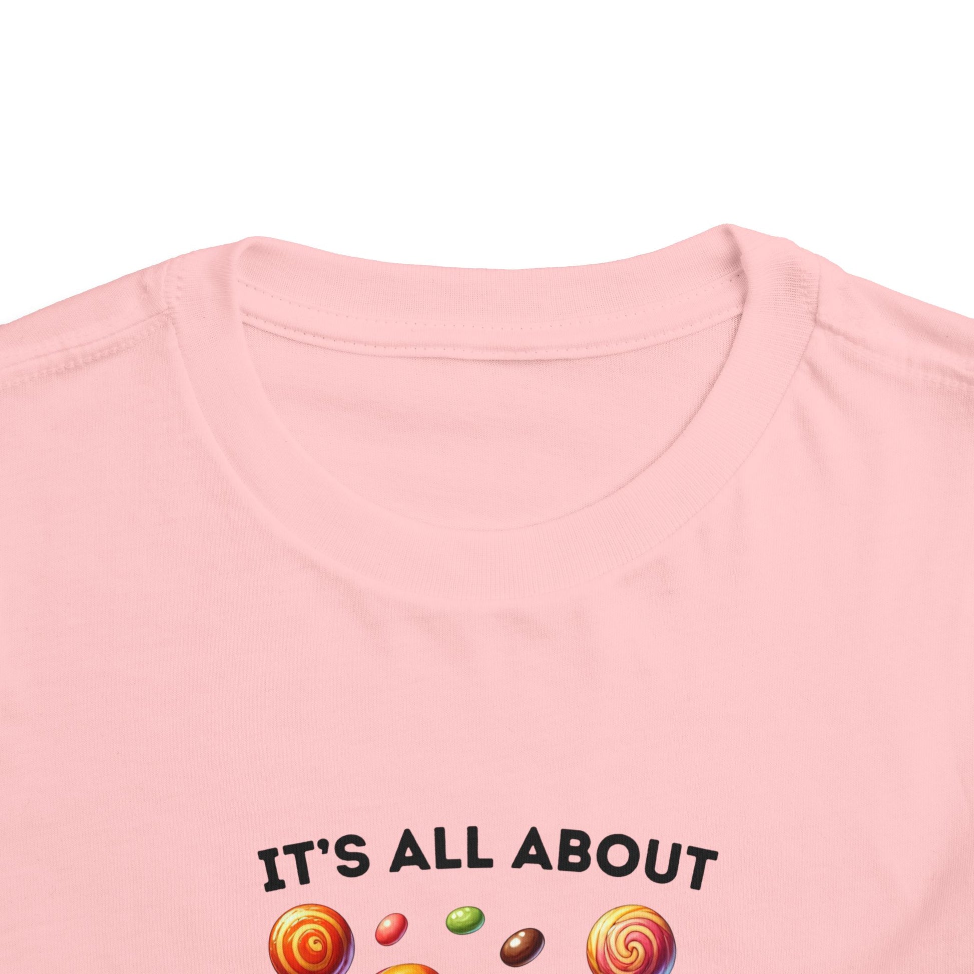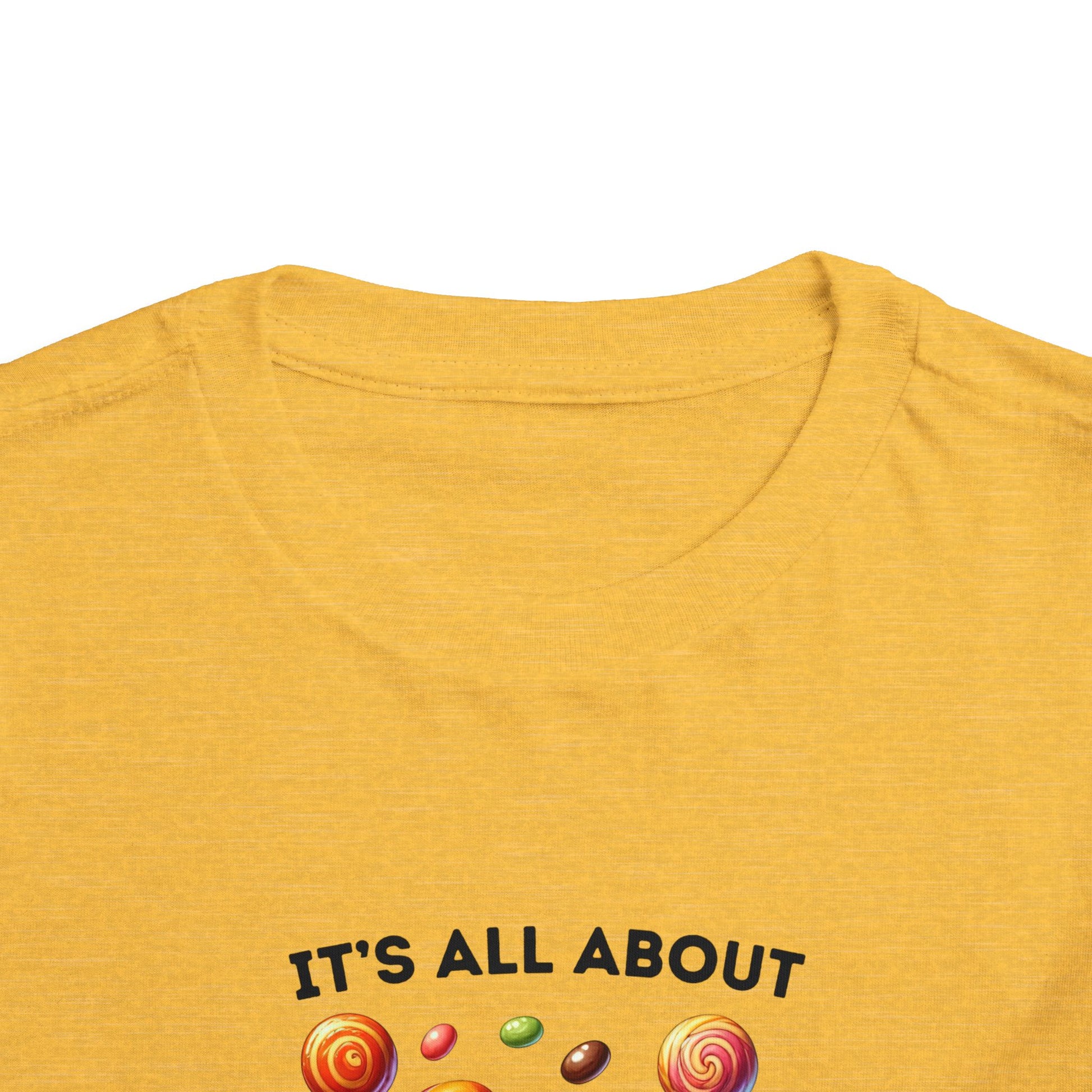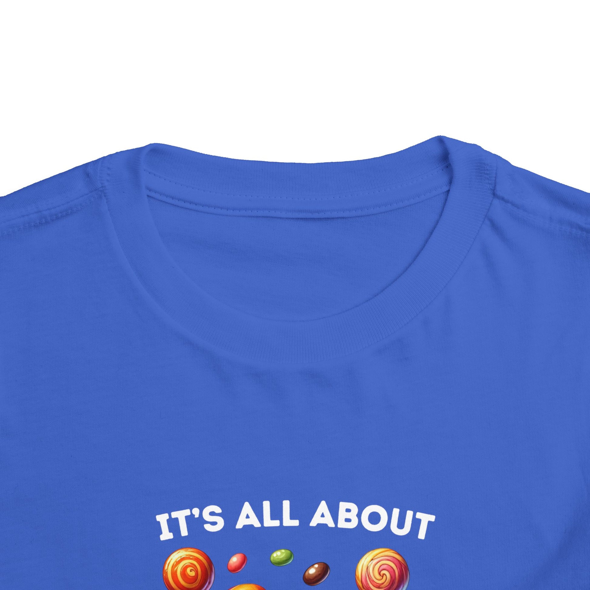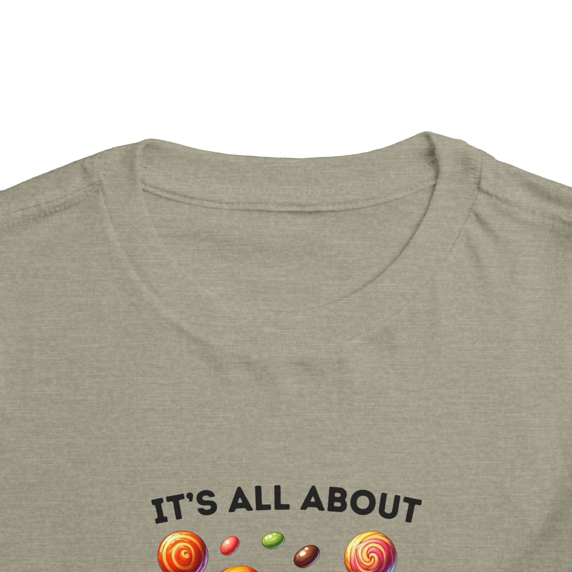 This adorable toddler tee features a perfect for Halloween, featuring a monster & floating candy with the quote 'It's all about the candy'. Suitable for school or hanging out with friends, this tee is ideal for youths looking to embrace the Halloween spirit. Perfect for Halloween parties, trick-or-treating, and school events.